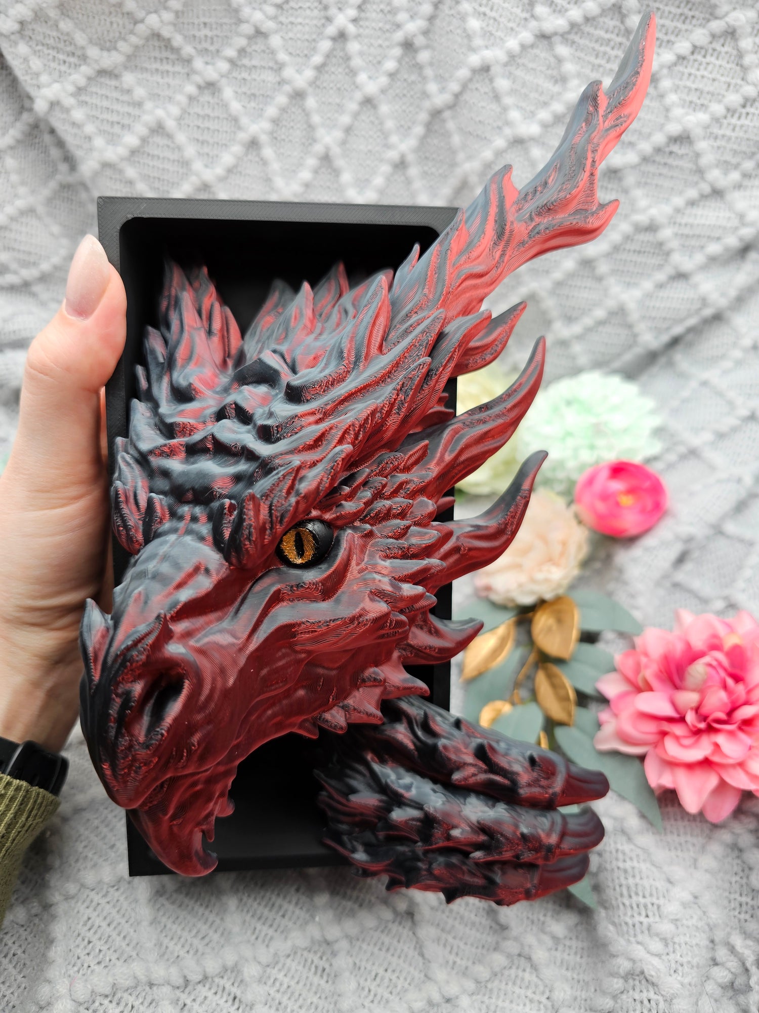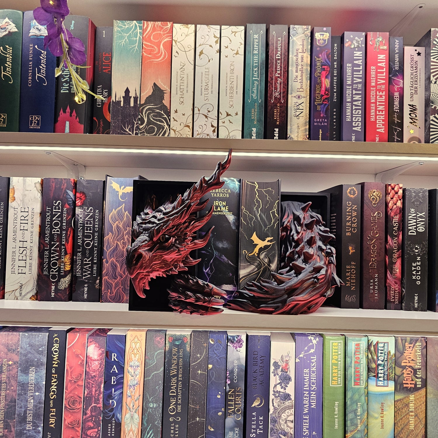 Book Nook Flammendrache Rot/Schwarz glänzend Set/Einzeln | 3D Druck | Buchstütze | Dekoration Bücherregal