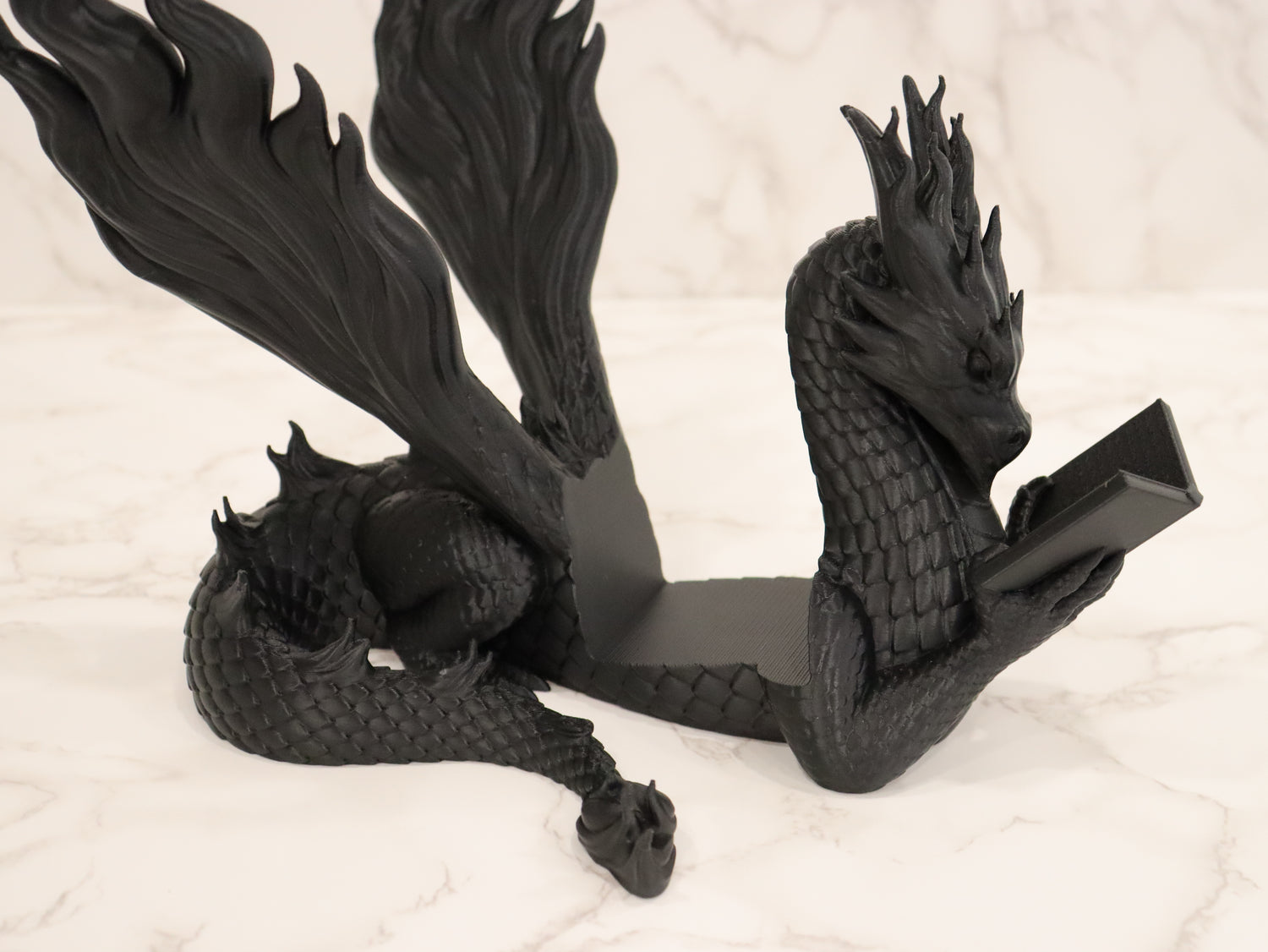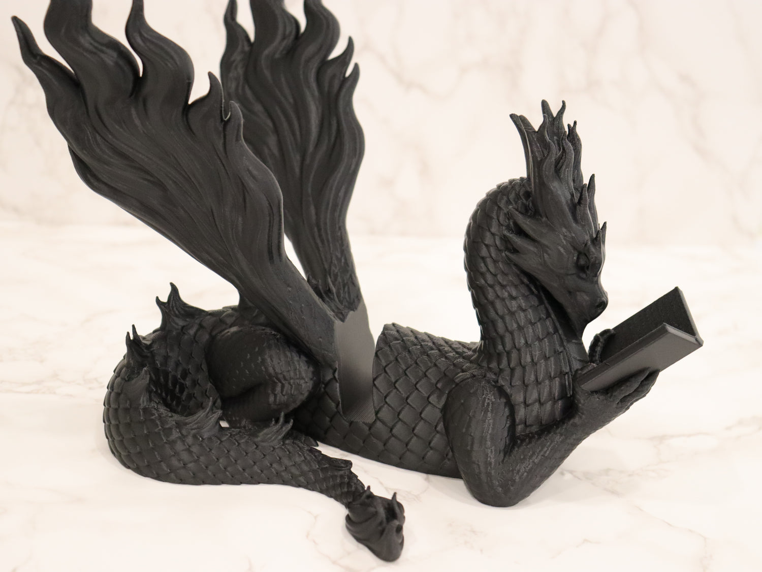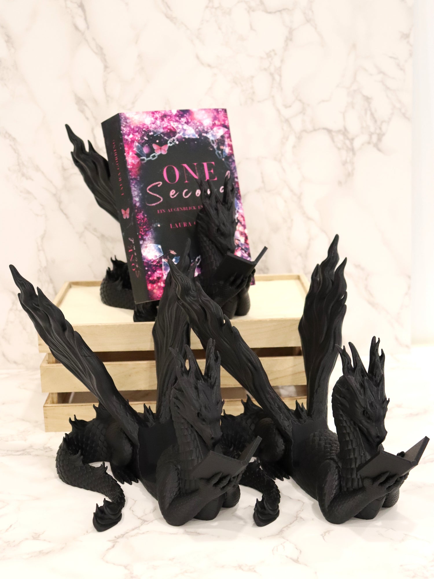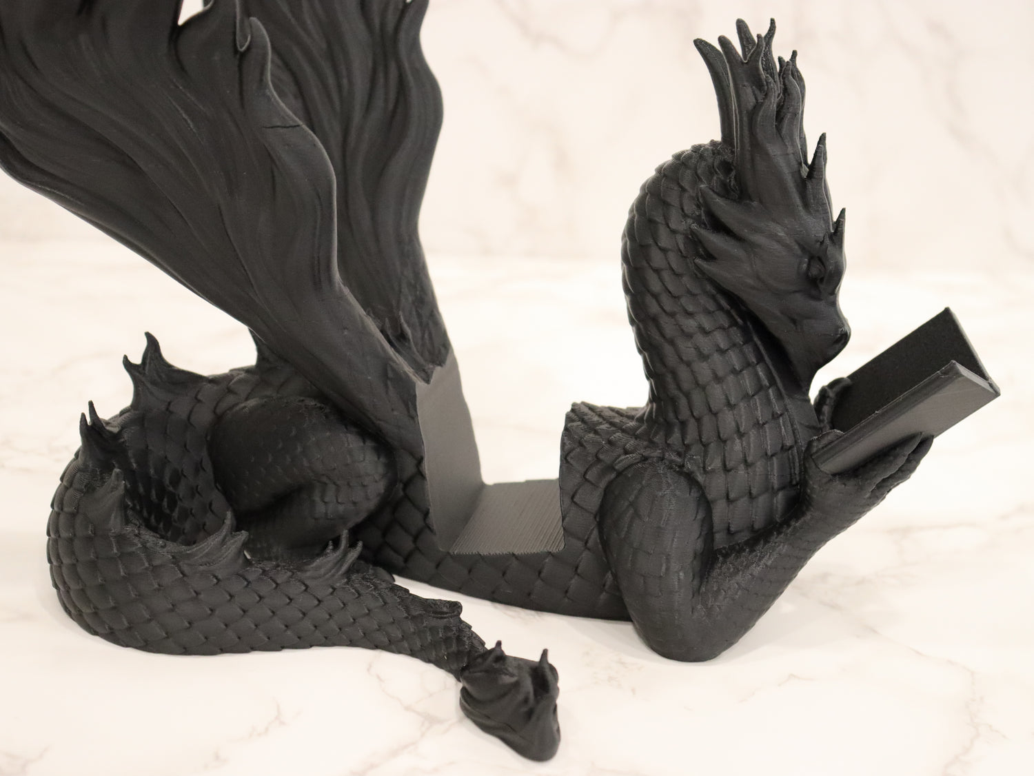 Buchhalter lesender Flammendrache Schwarz | verschiedene Größen | 3D Druck | Aufsteller Bücher E-Reader Tablet