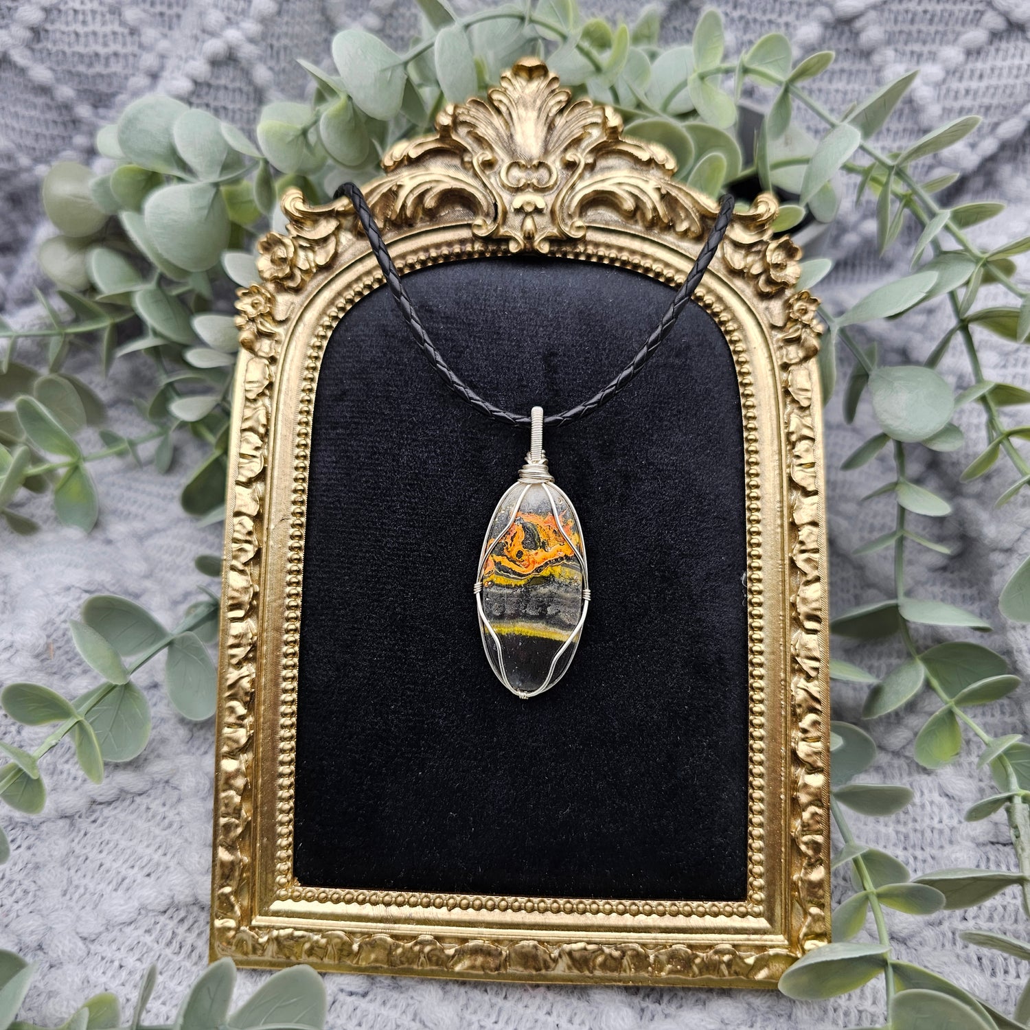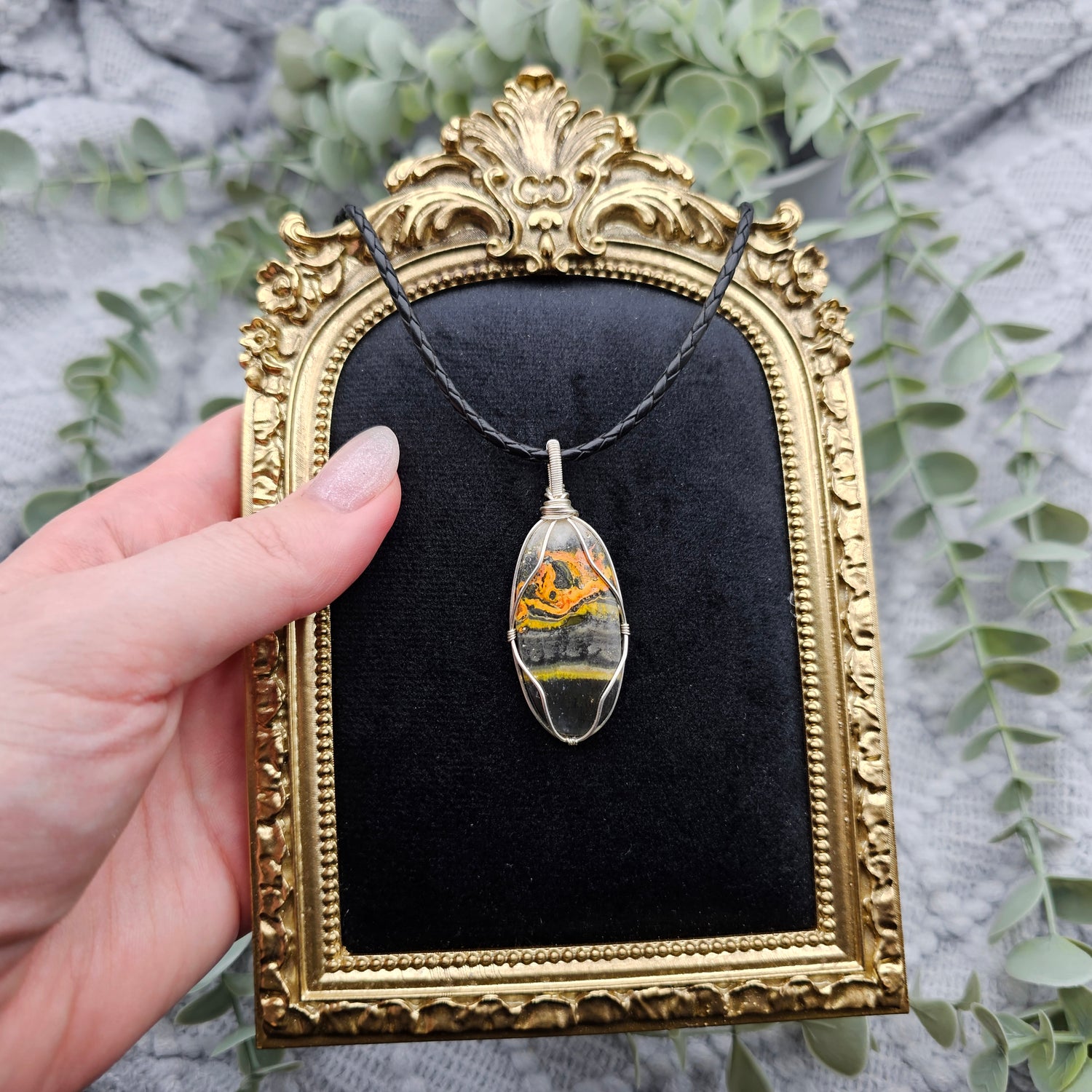 Der Anhänger ist in silberfarbenen Schmuckdraht gefasst und ein Einzelstück.