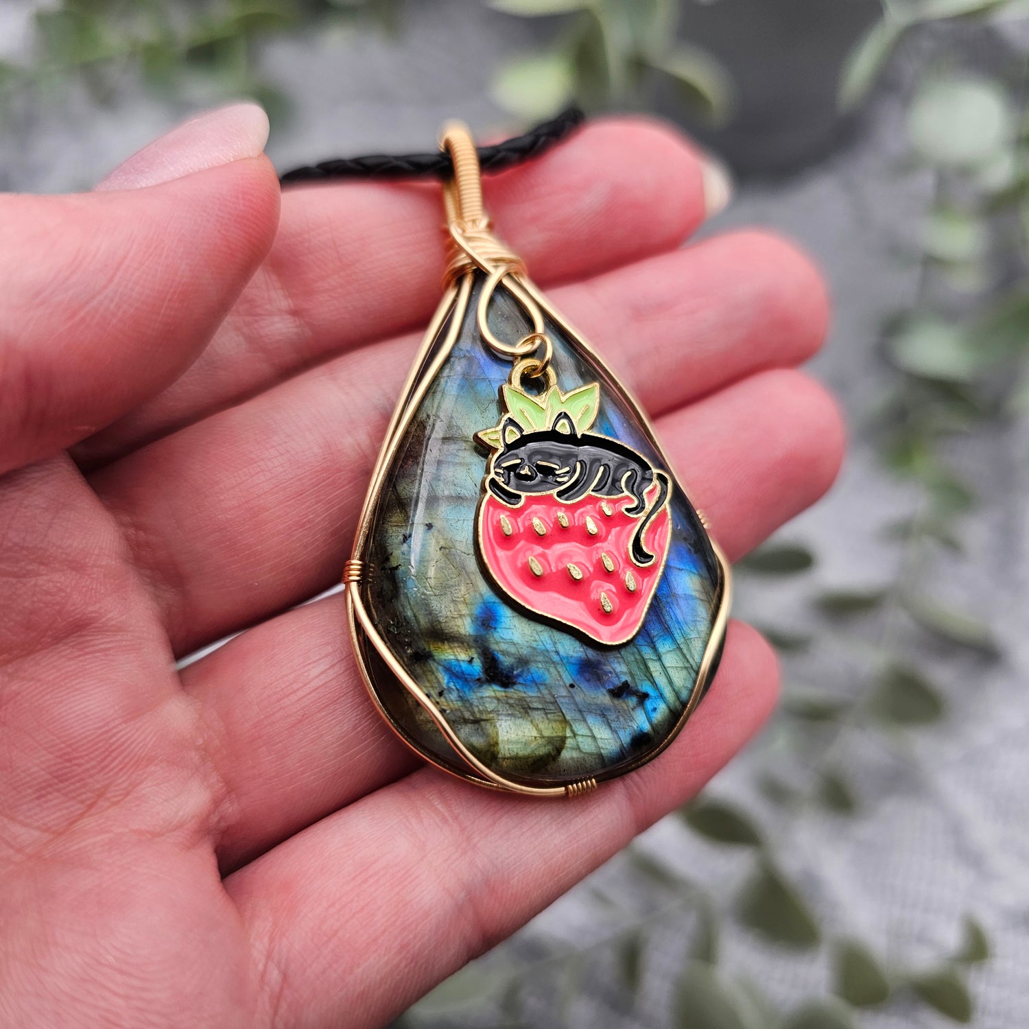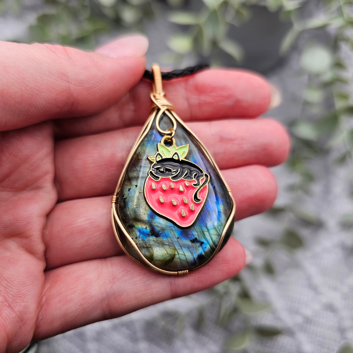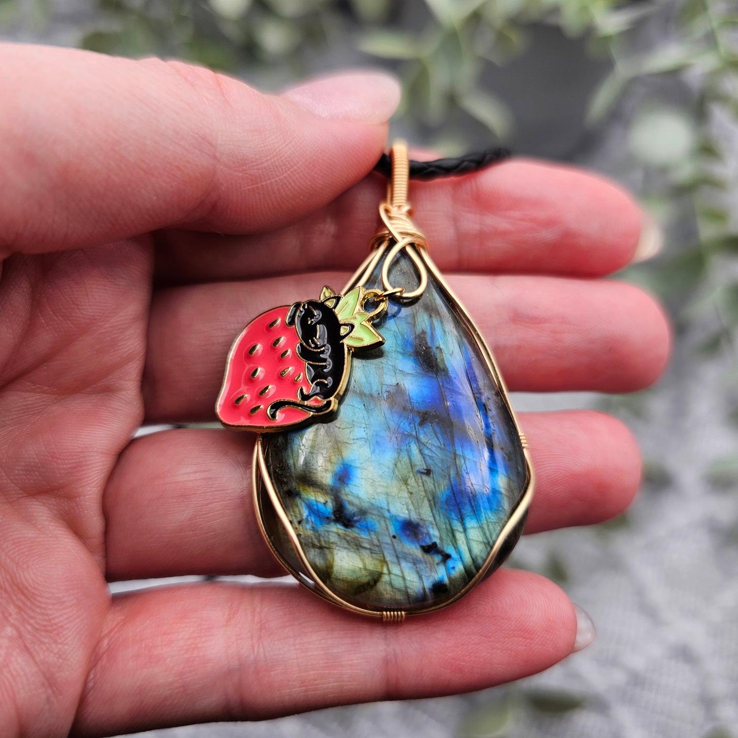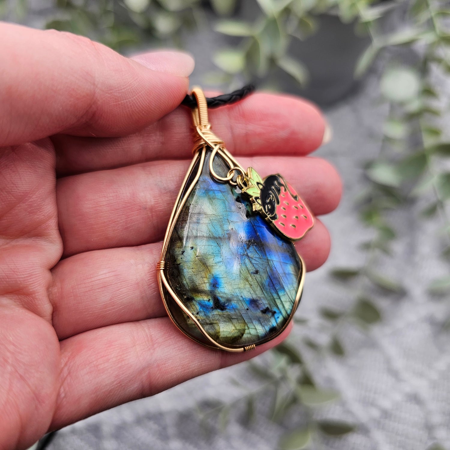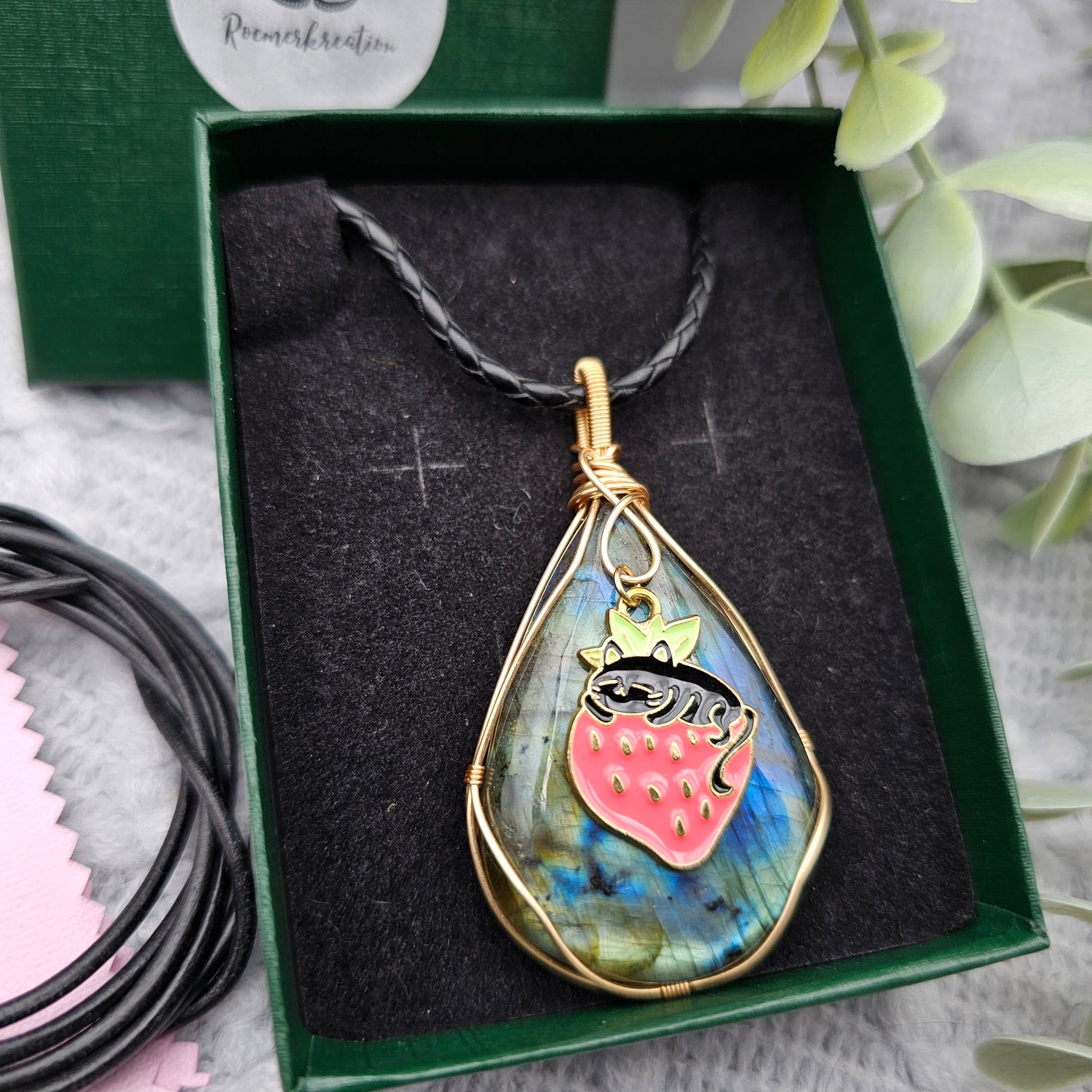Labradorit & Erdbeerkatze Anhänger | Schmuckdraht | Edelstein Halskette