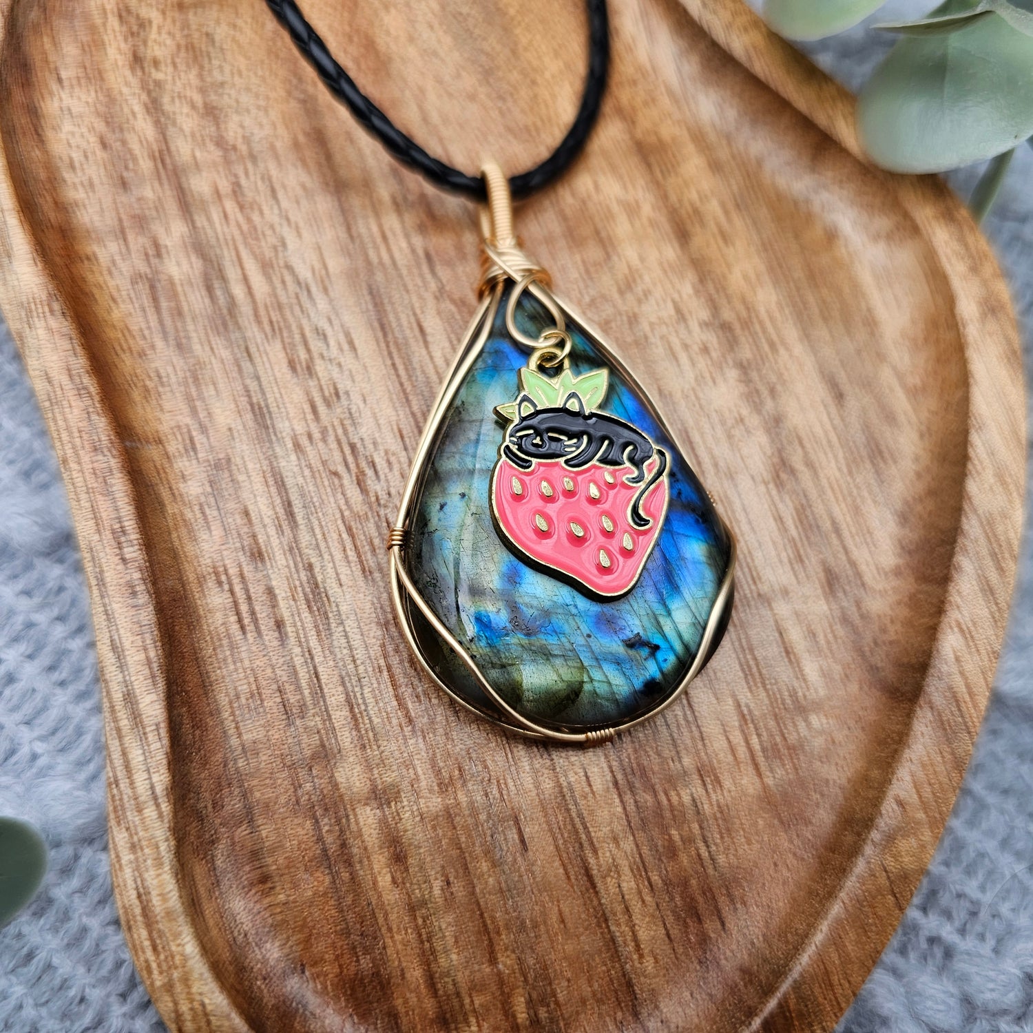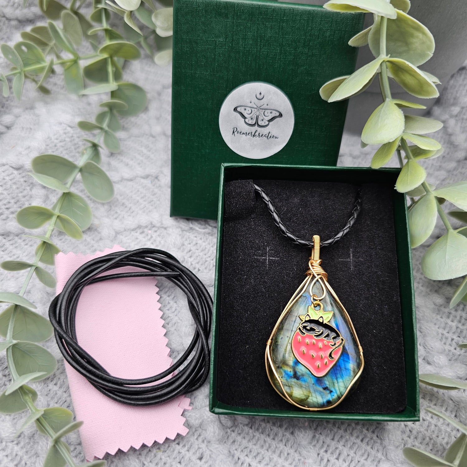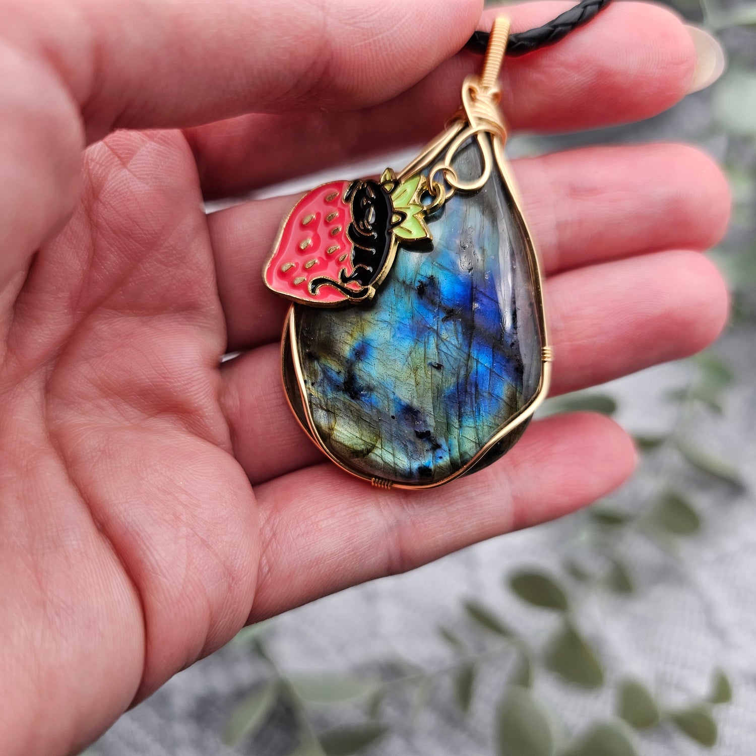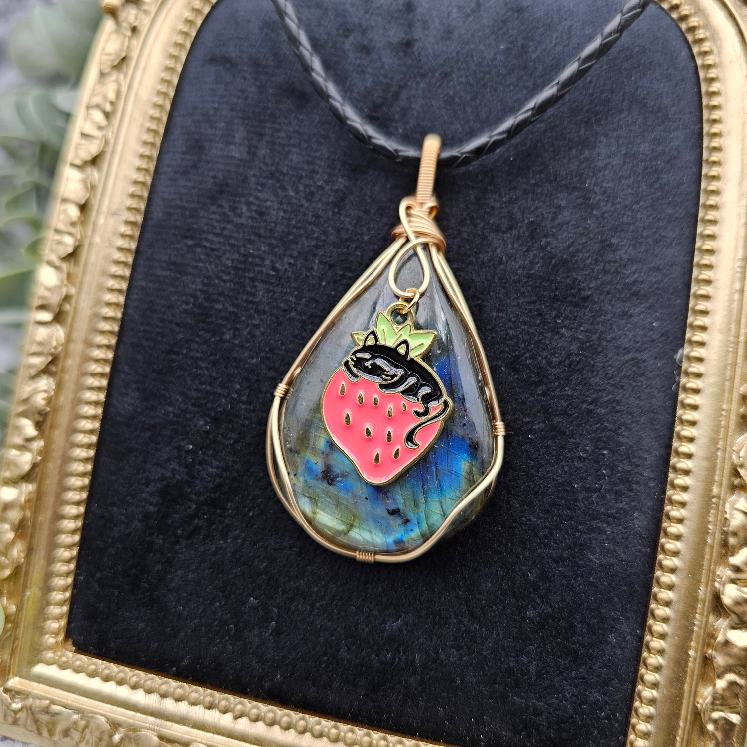 Labradorit & Erdbeerkatze Anhänger | Schmuckdraht | Edelstein Halskette