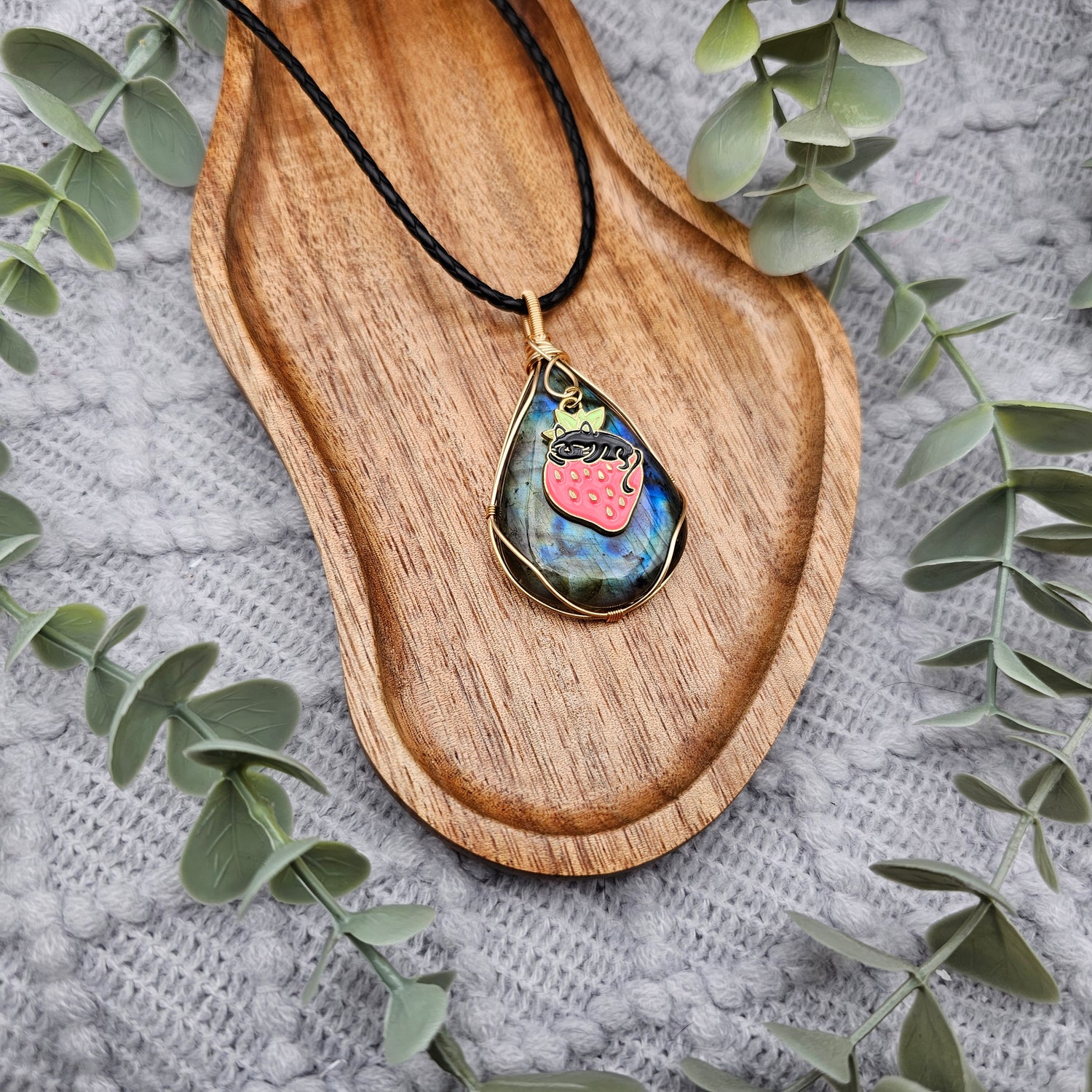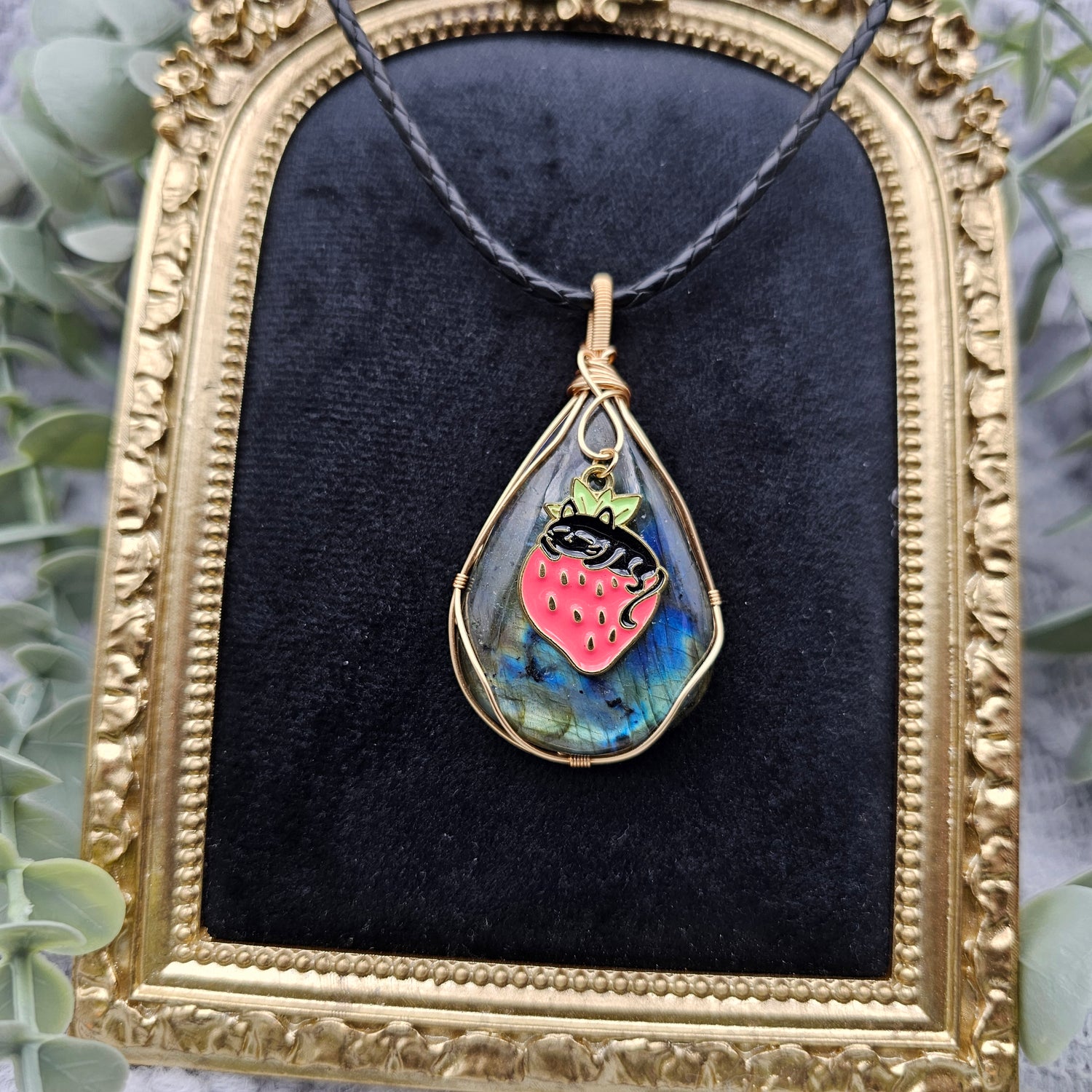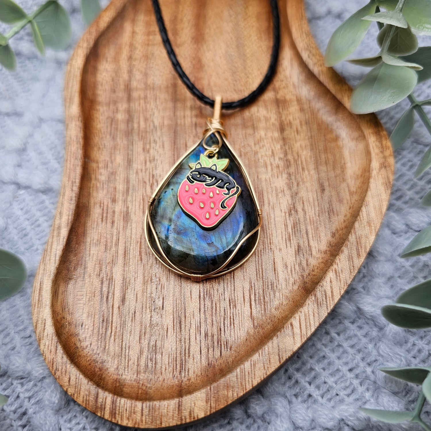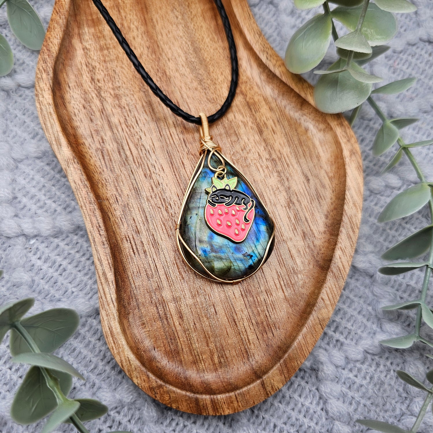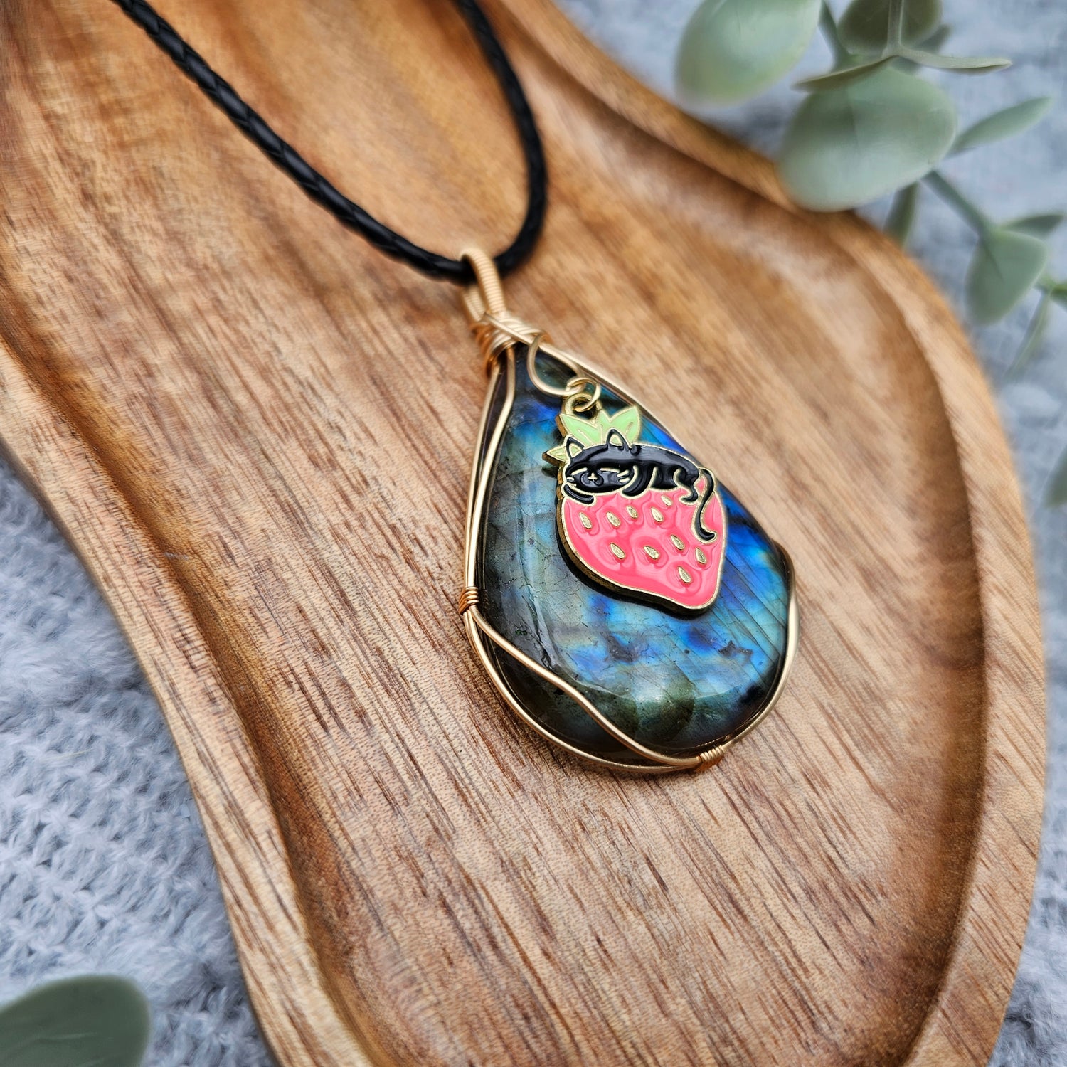 Labradorit & Erdbeerkatze Anhänger | Schmuckdraht | Edelstein Halskette