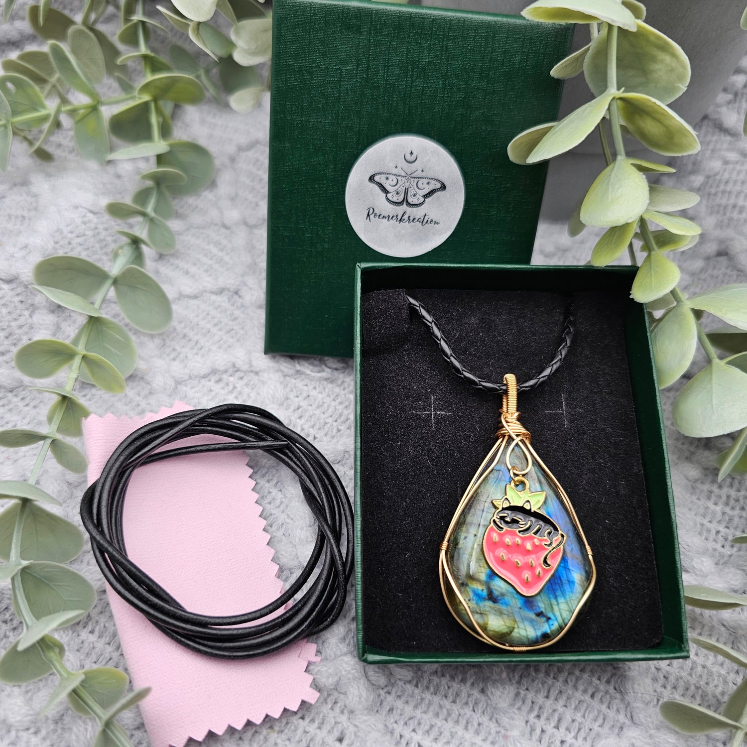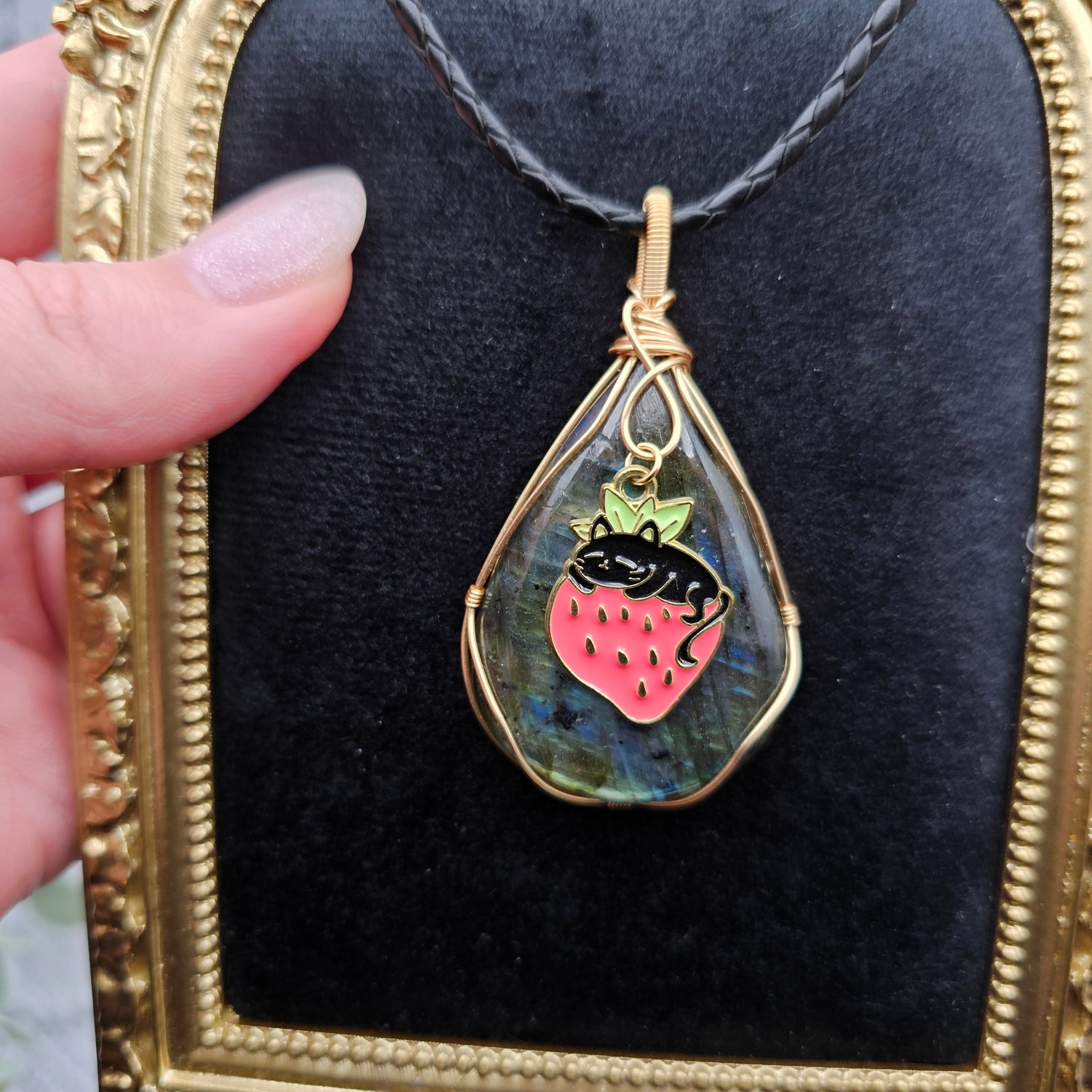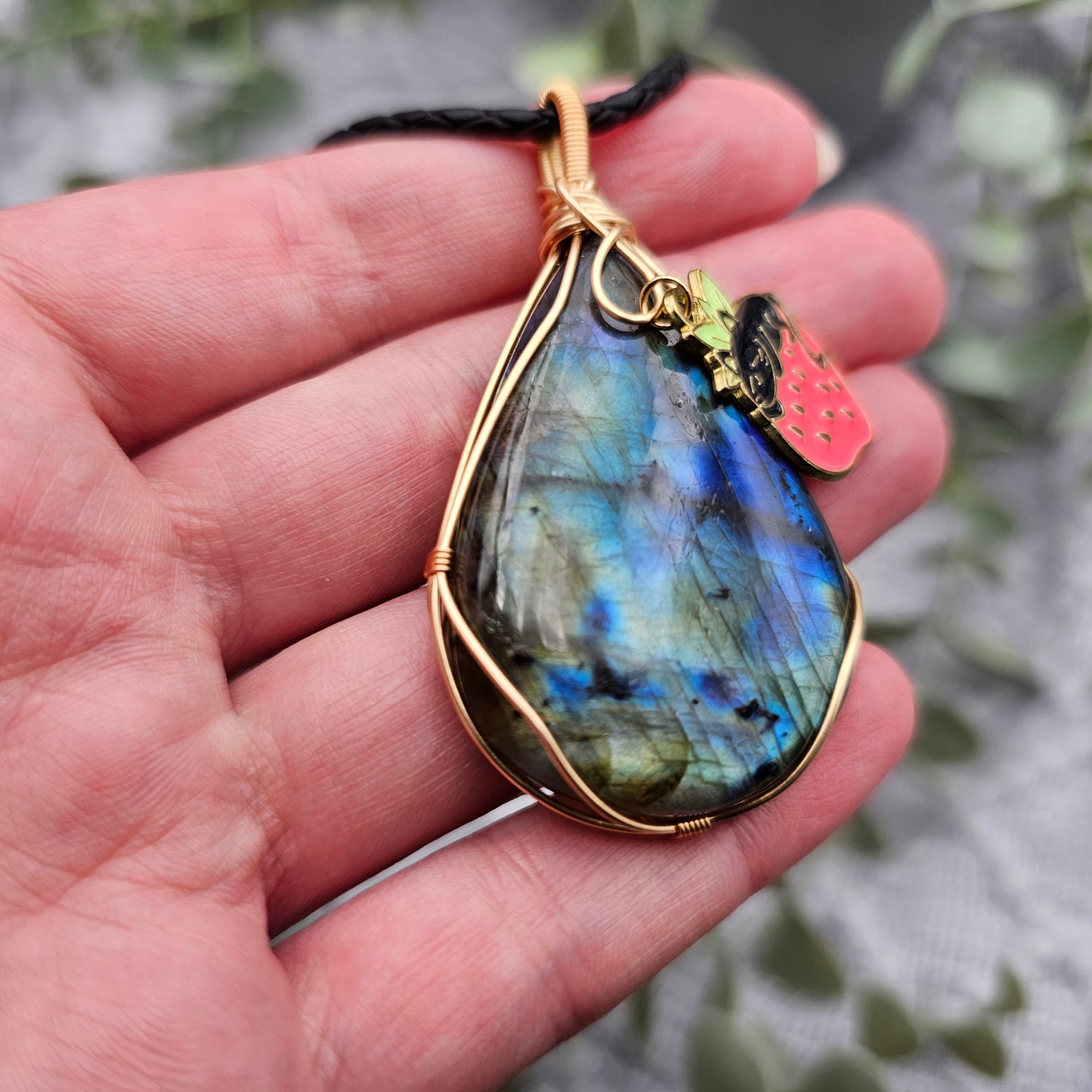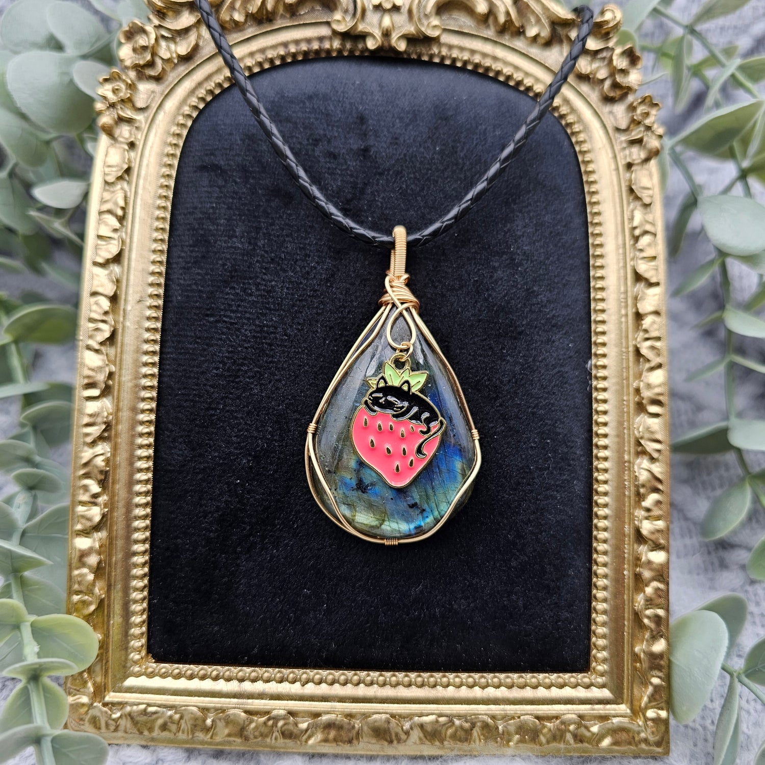 Labradorit & Erdbeerkatze Anhänger | Schmuckdraht | Edelstein Halskette