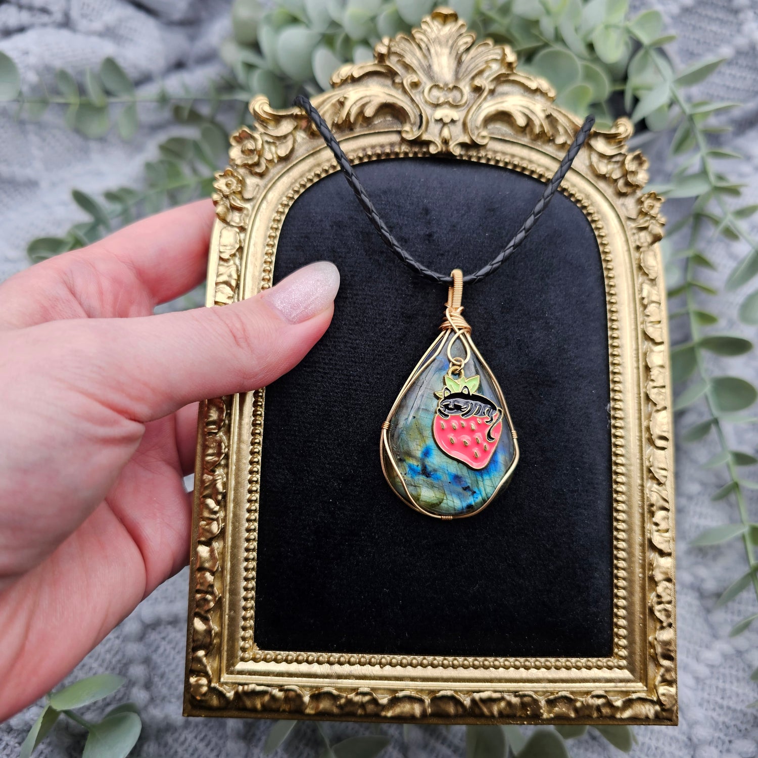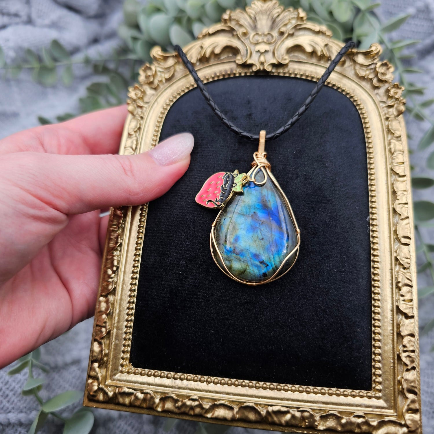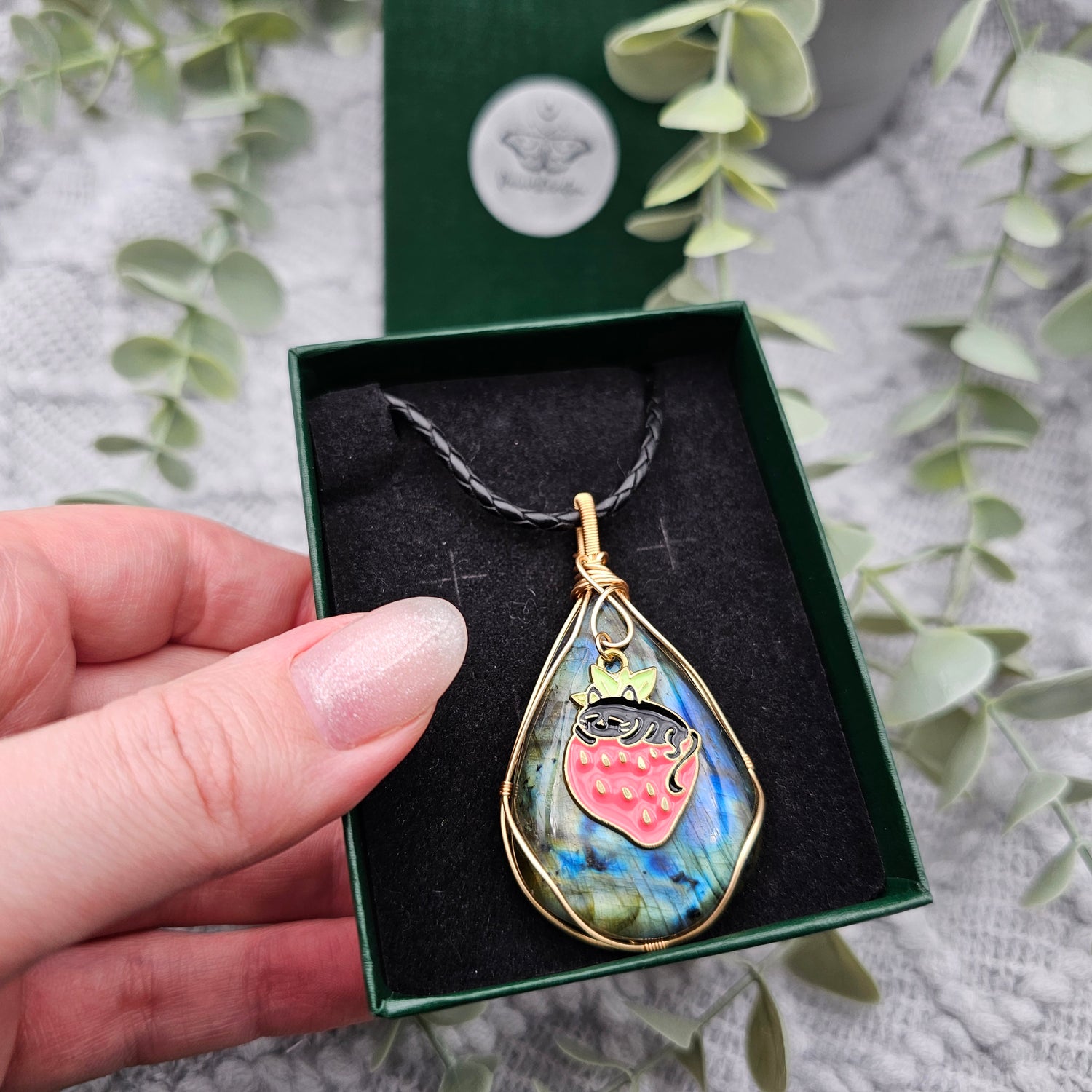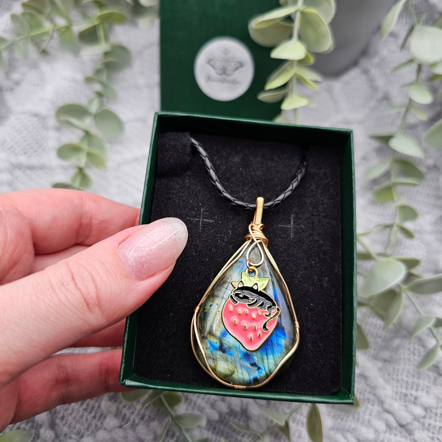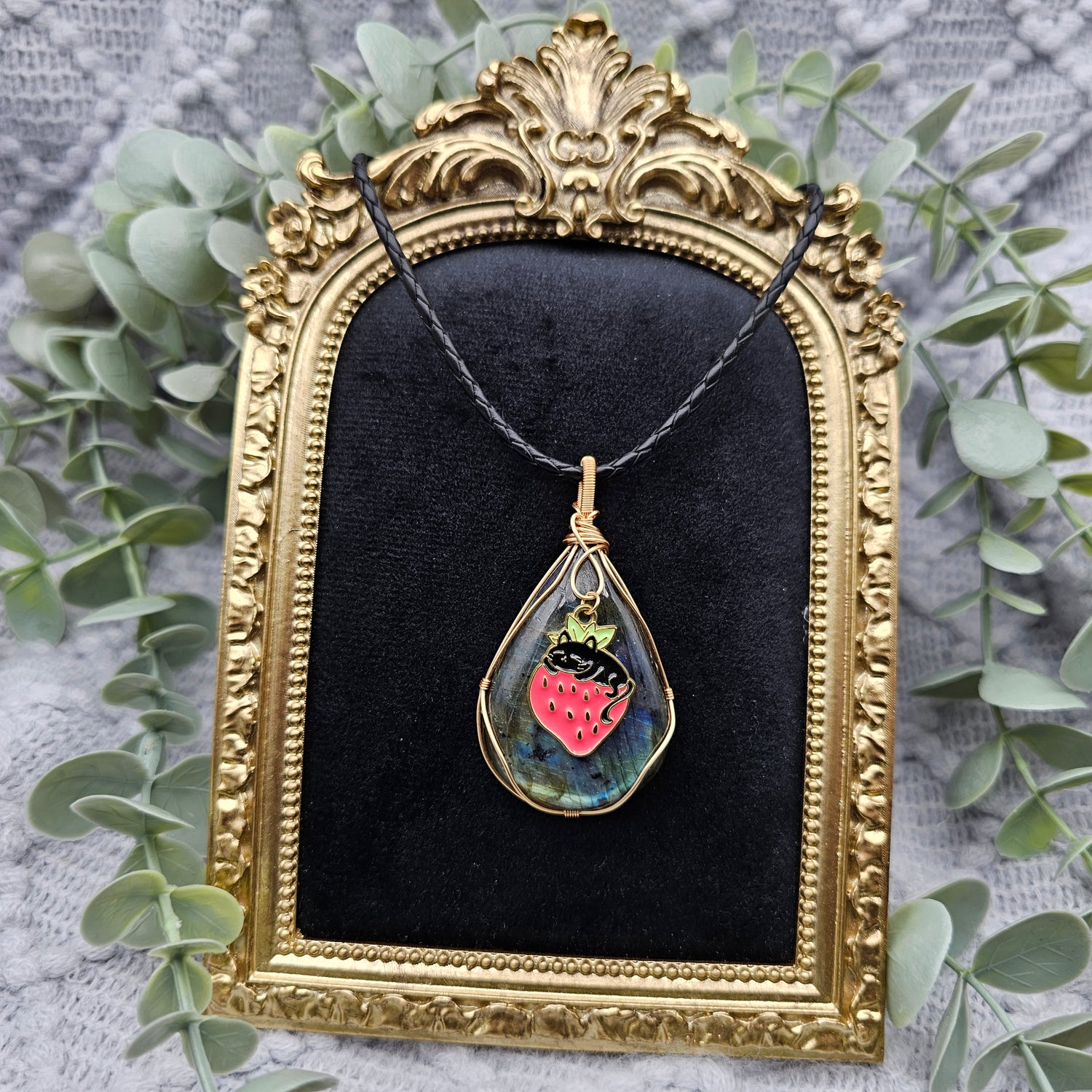 Labradorit & Erdbeerkatze Anhänger | Schmuckdraht | Edelstein Halskette