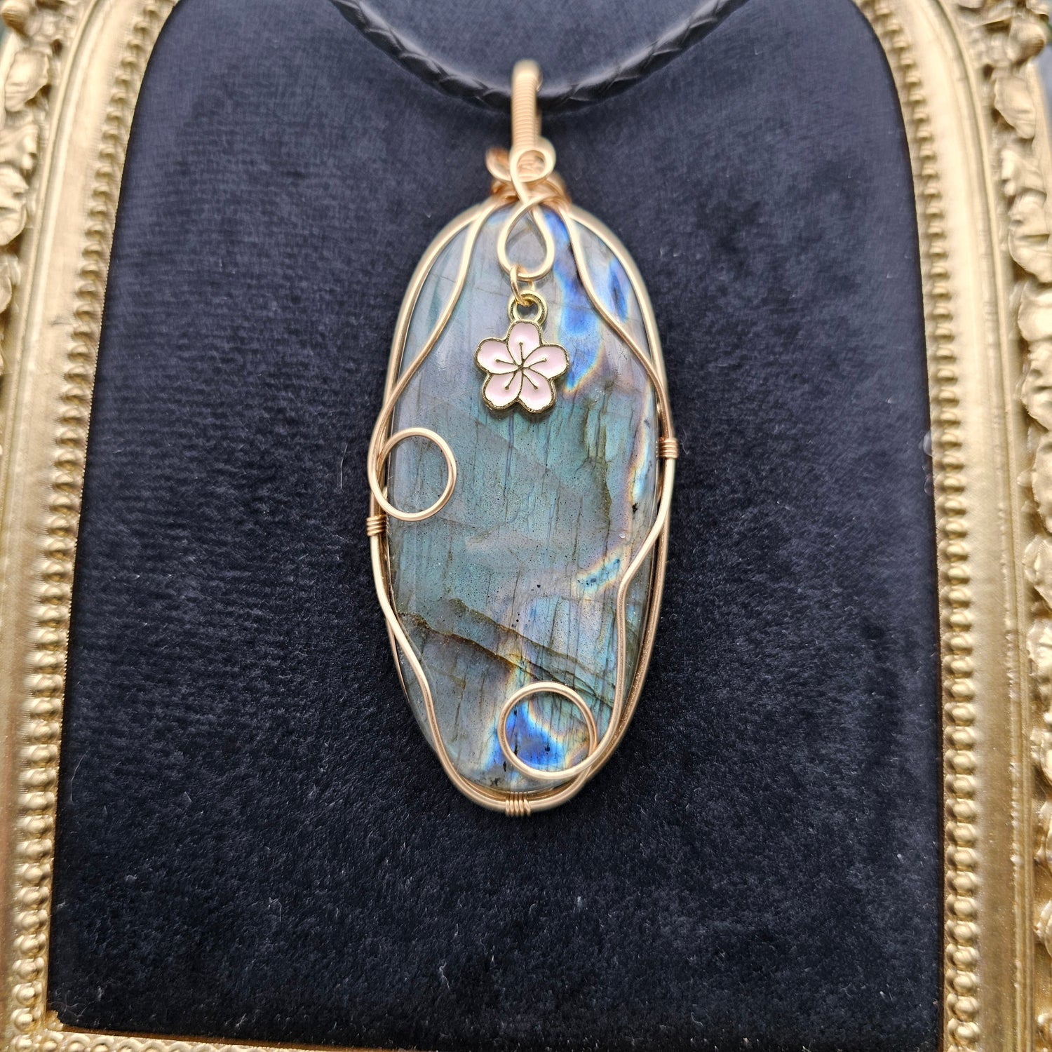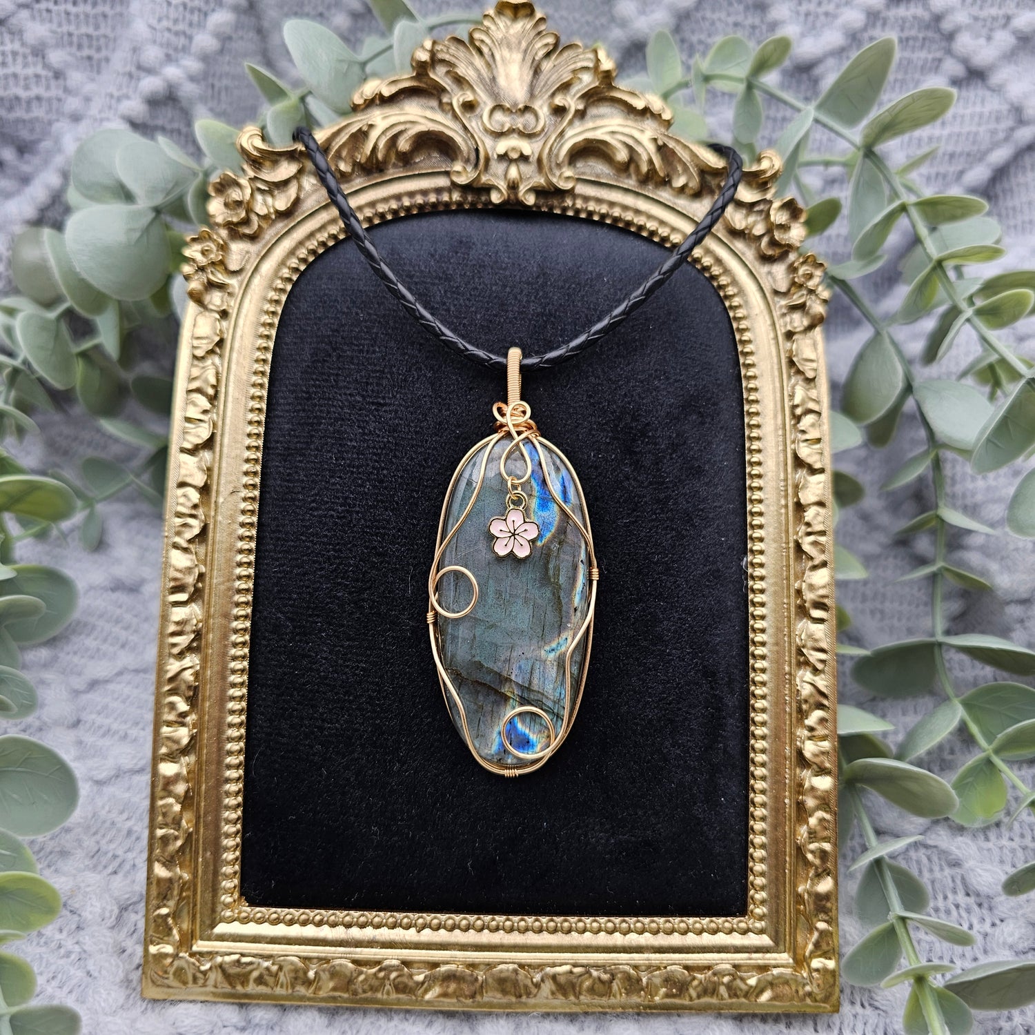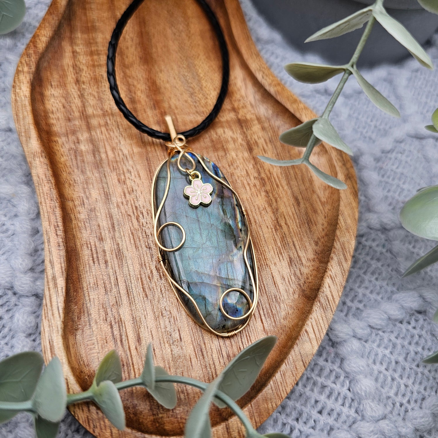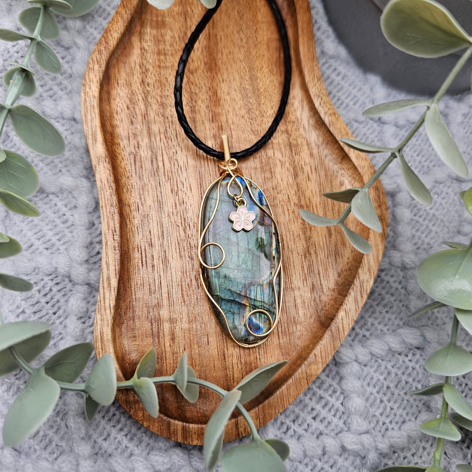 Labradorit & Sakura Anhänger | Schmuckdraht | Edelstein Halskette