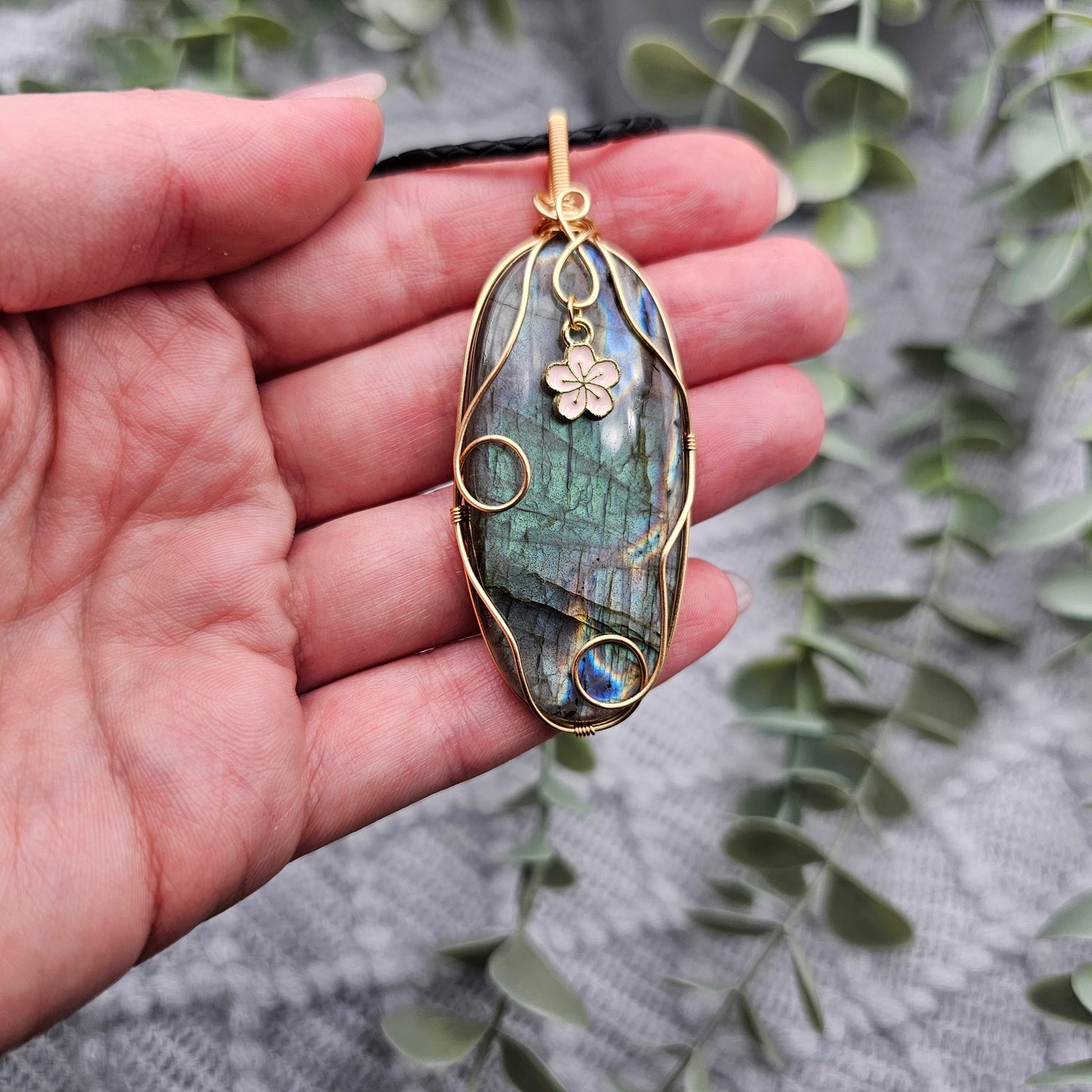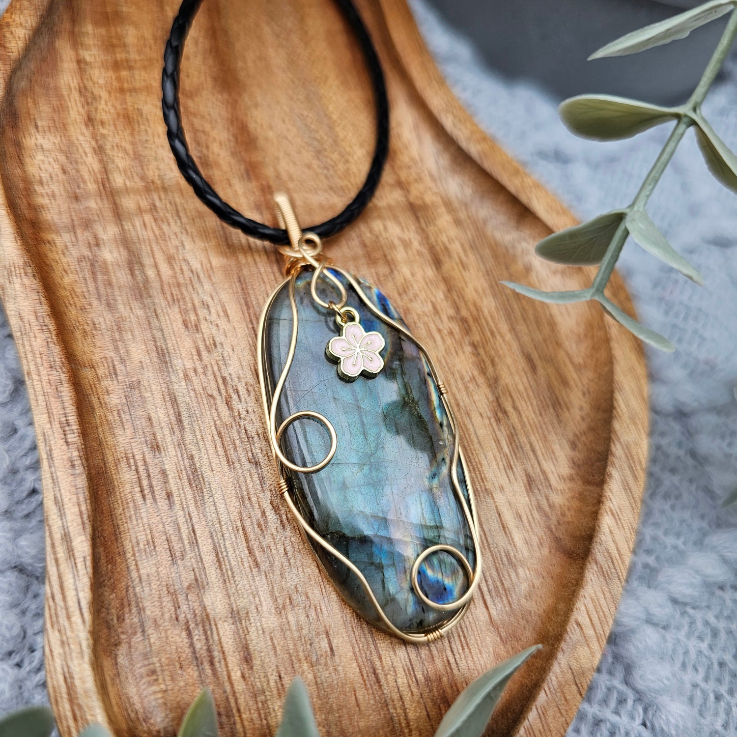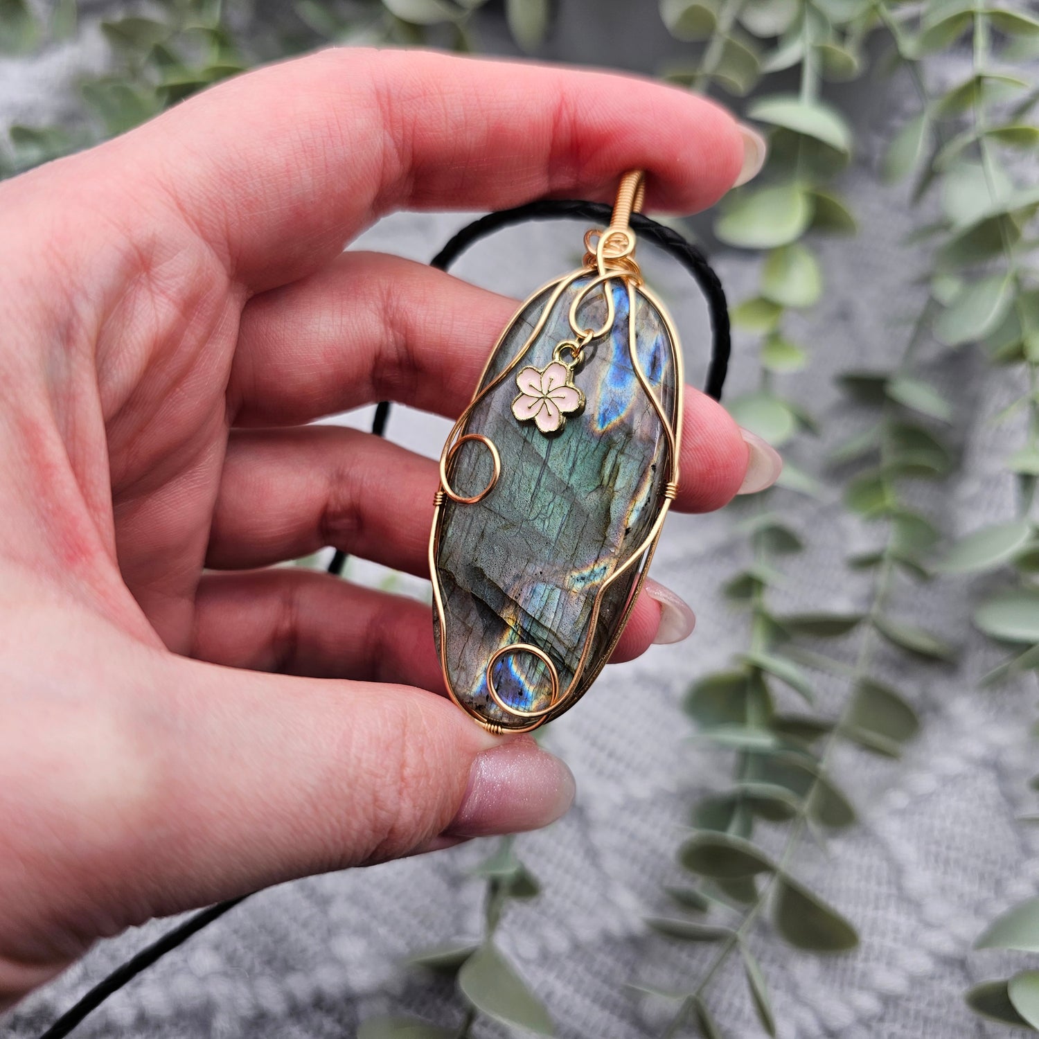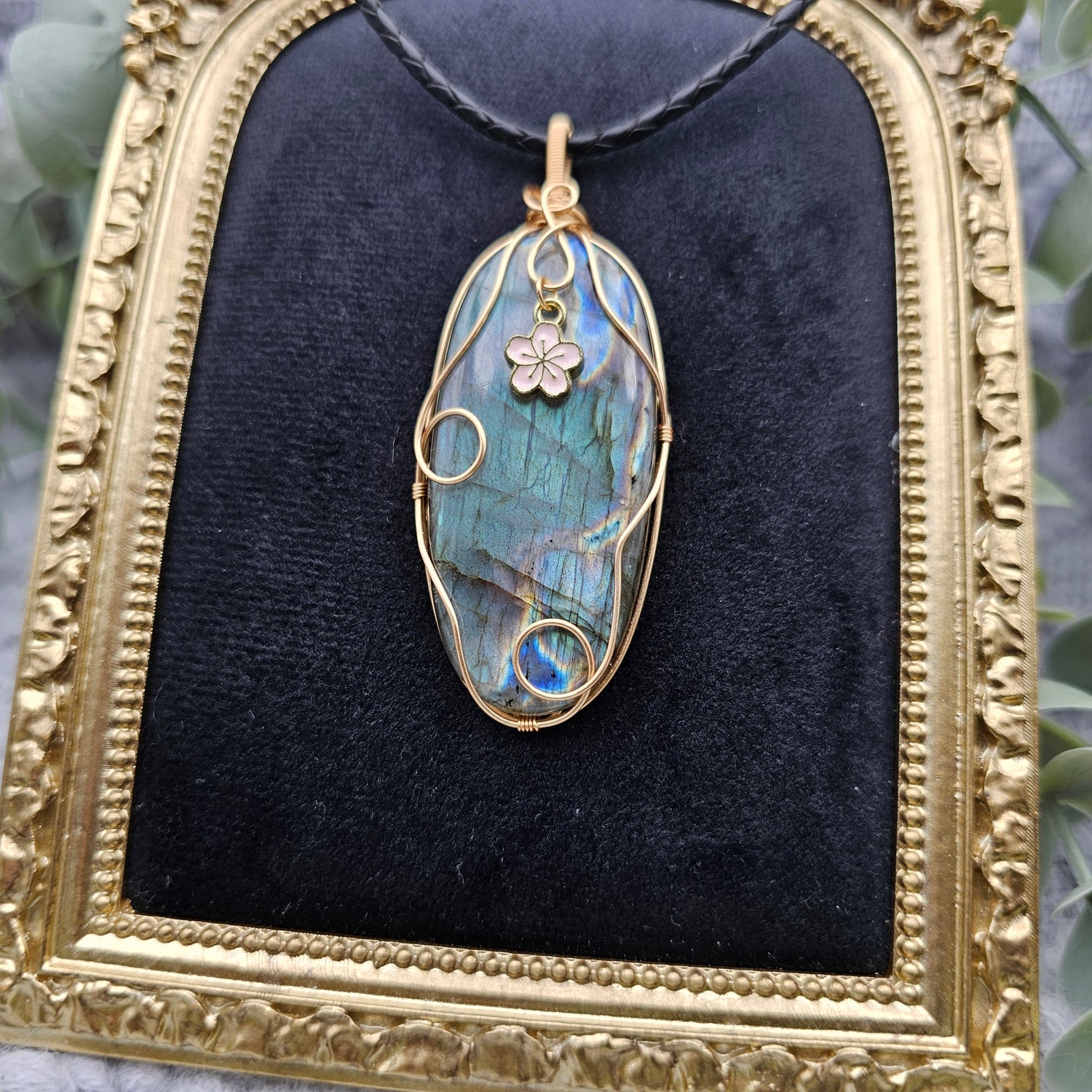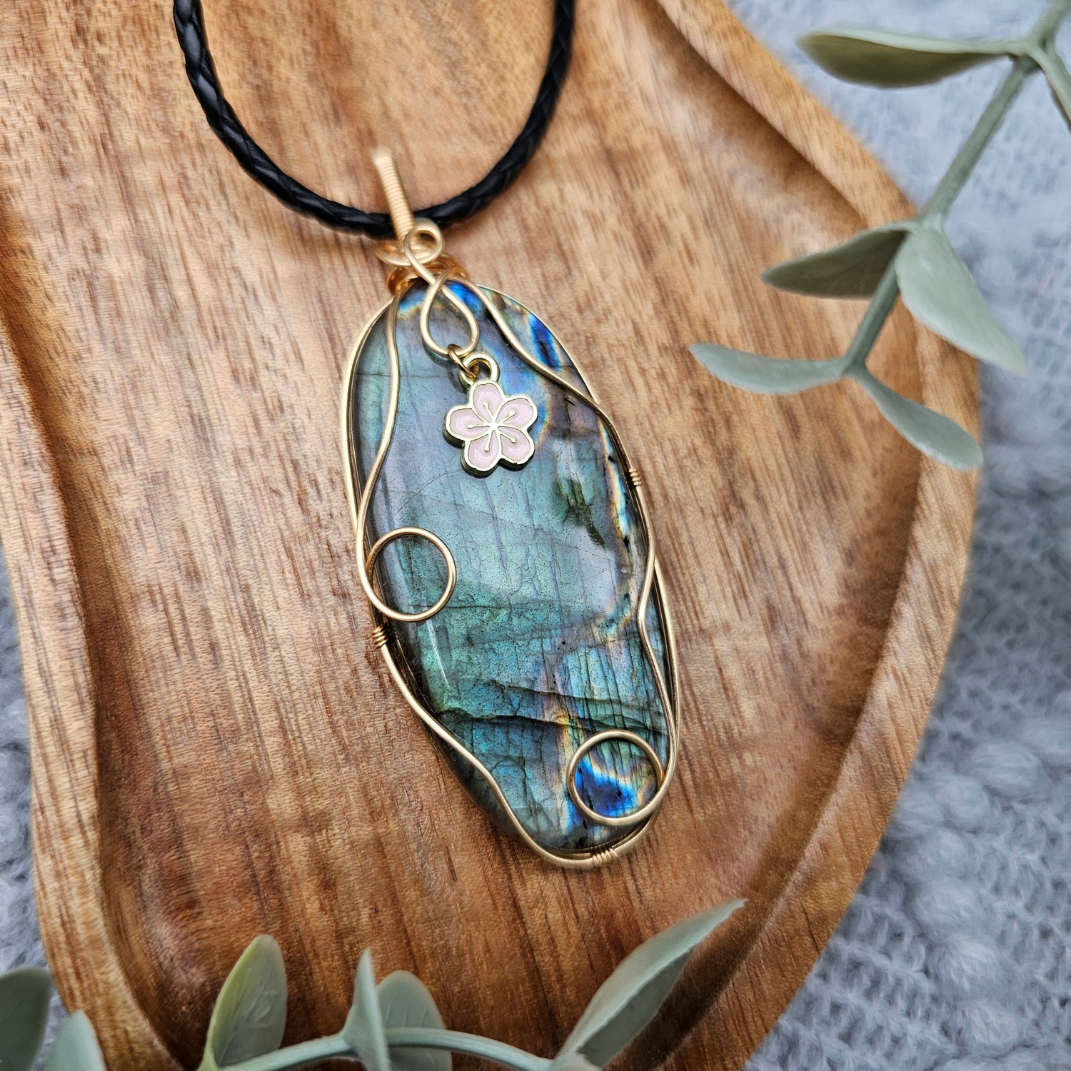 Labradorit & Sakura Anhänger | Schmuckdraht | Edelstein Halskette