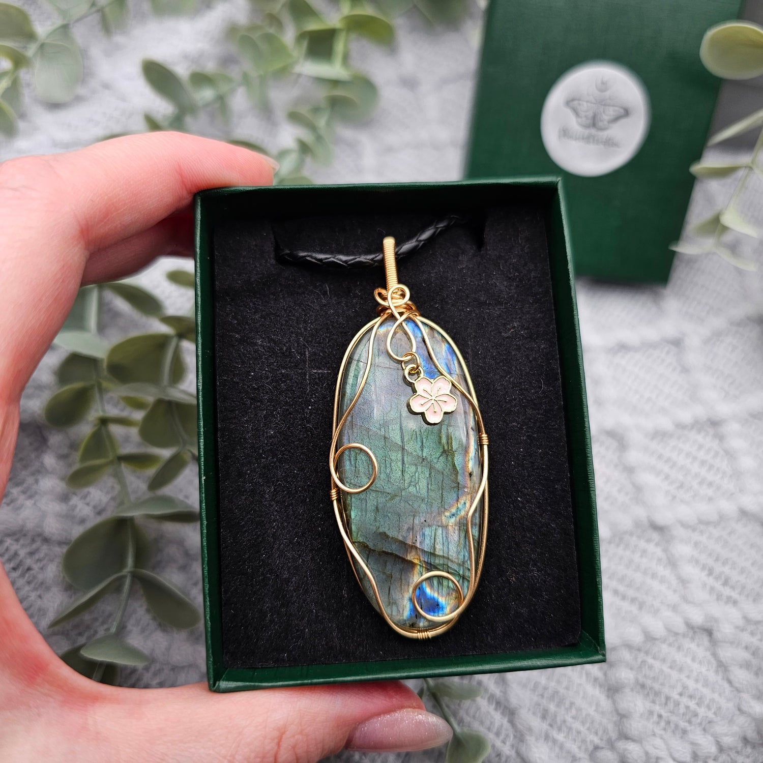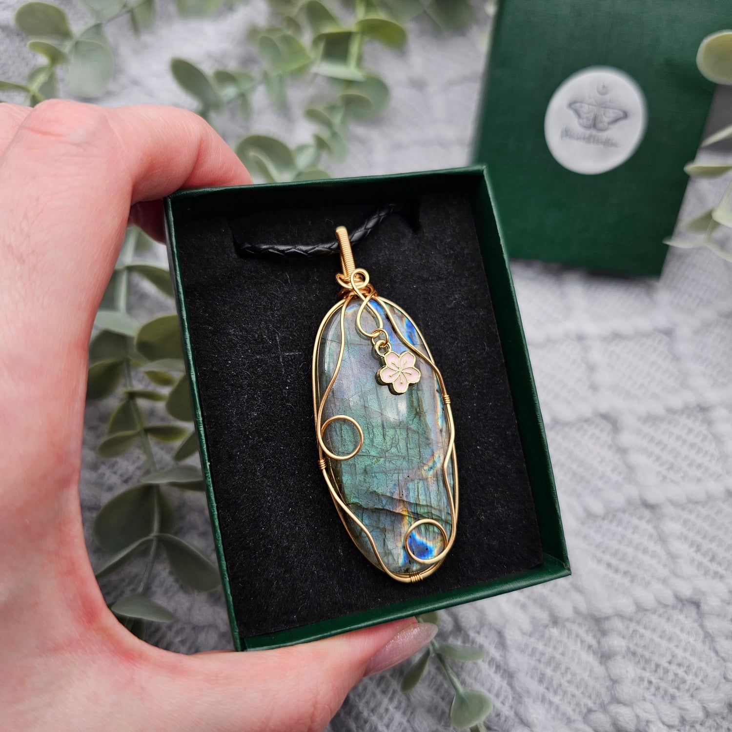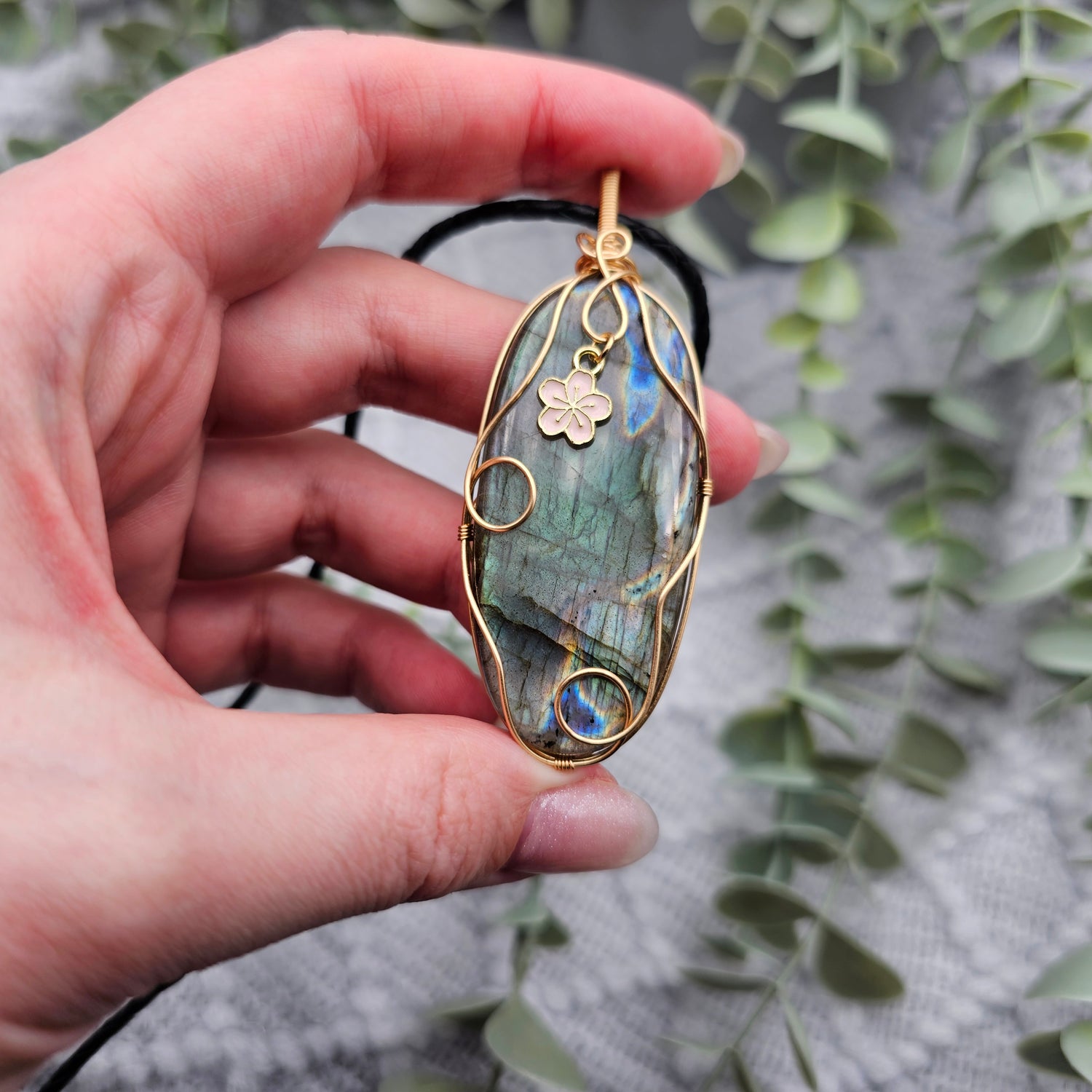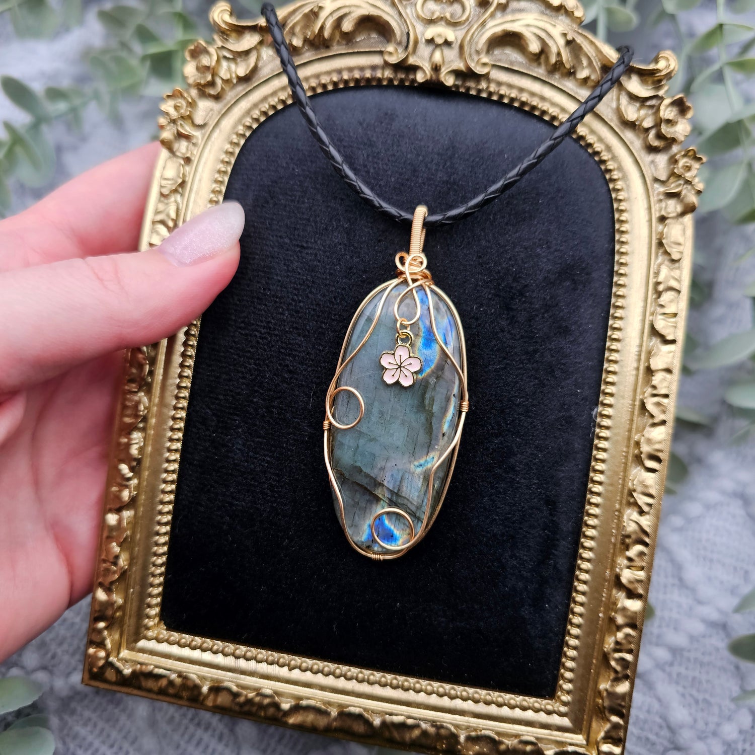 Labradorit & Sakura Anhänger | Schmuckdraht | Edelstein Halskette