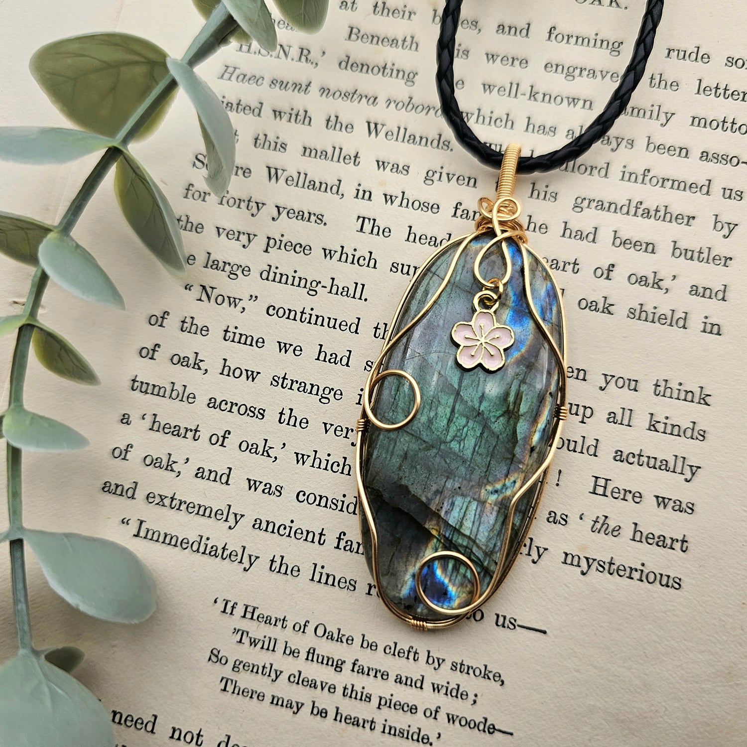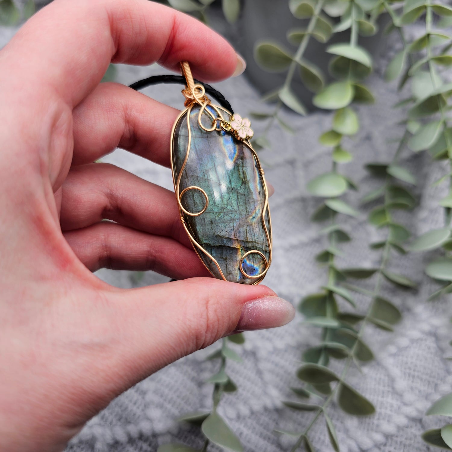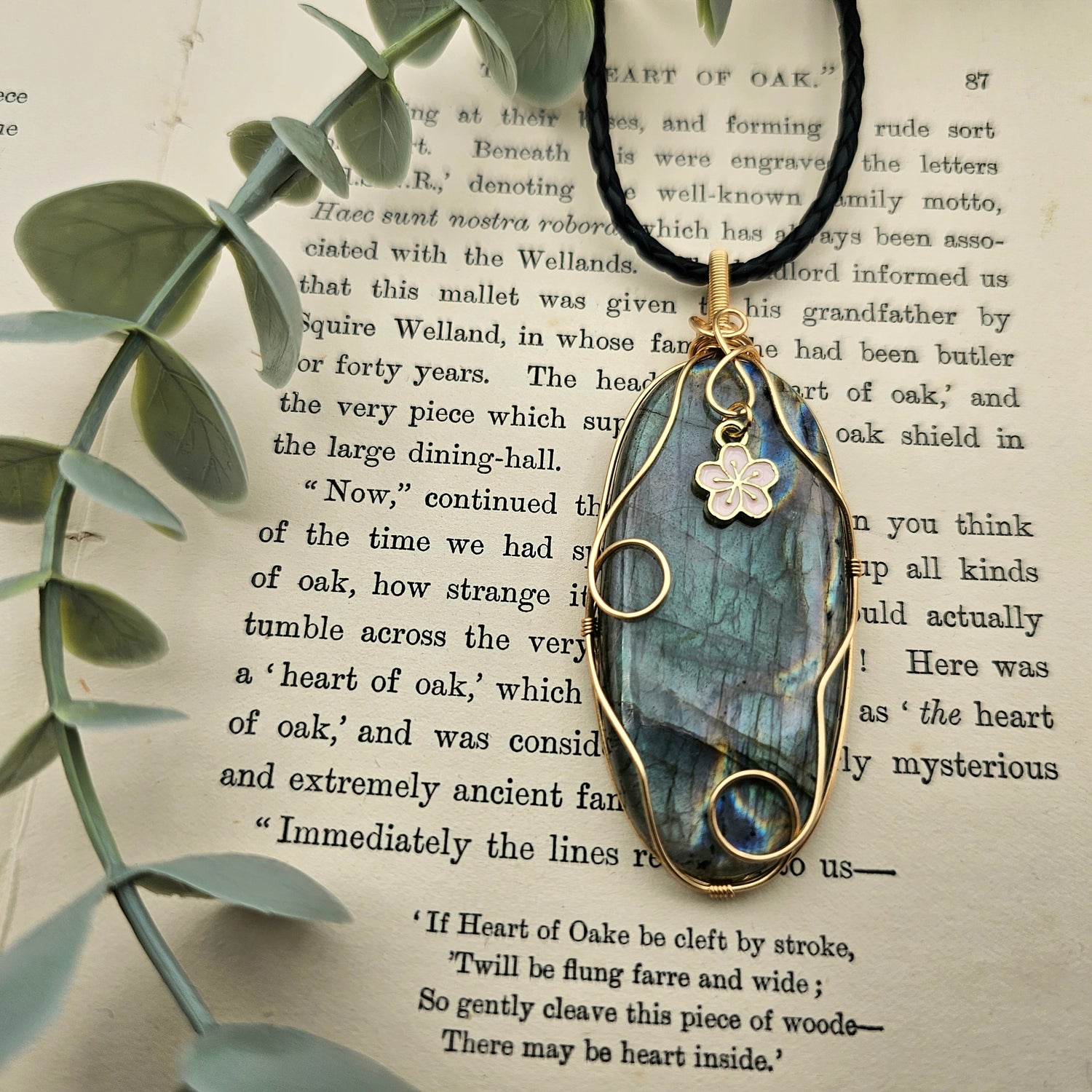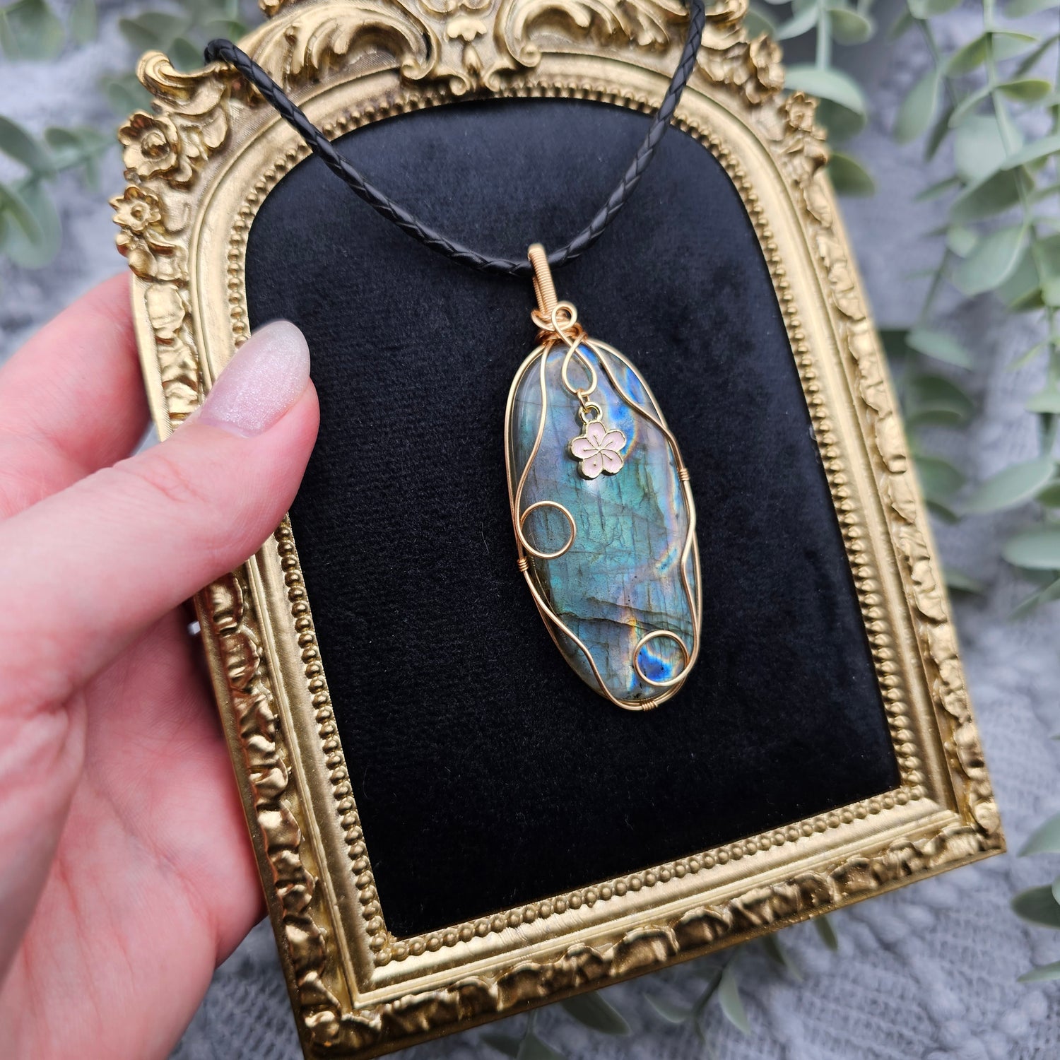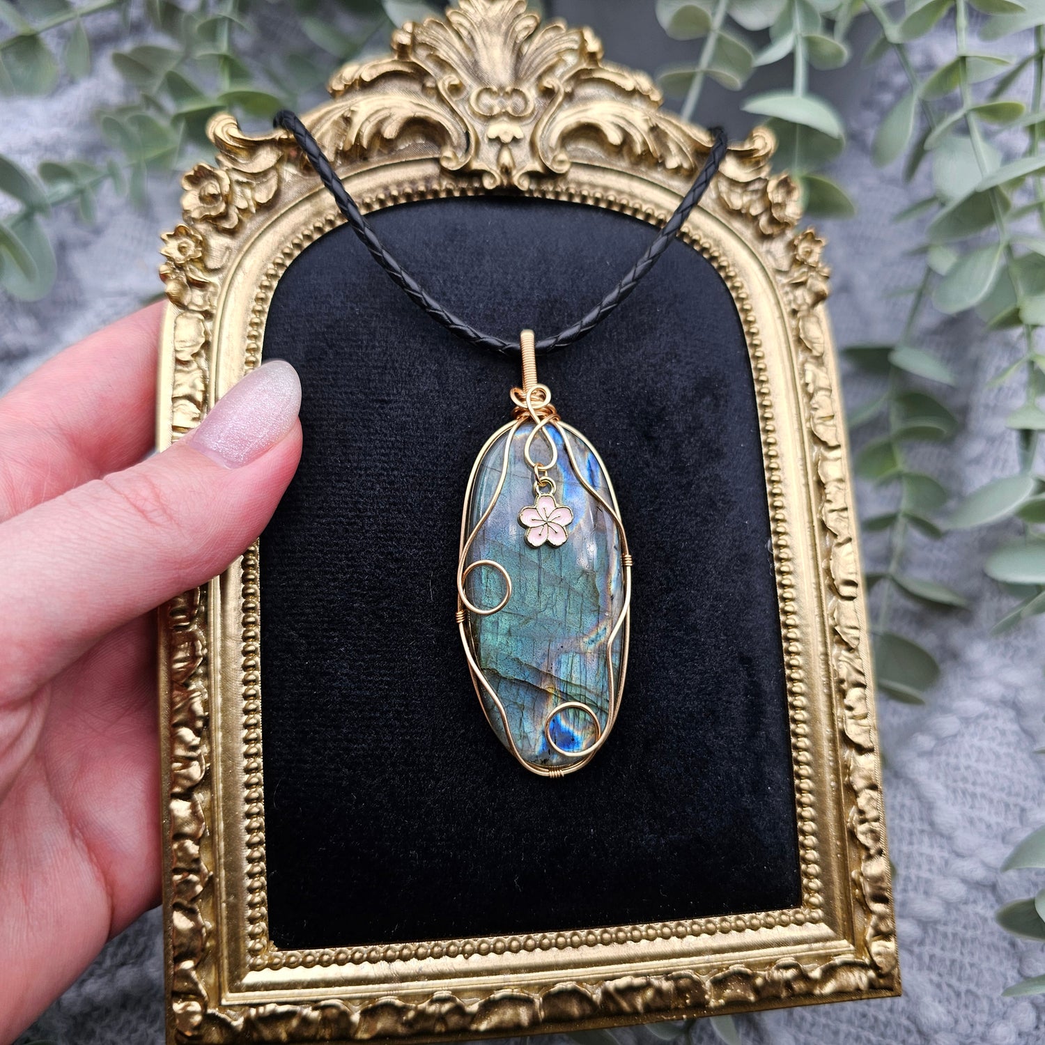 Labradorit & Sakura Anhänger | Schmuckdraht | Edelstein Halskette