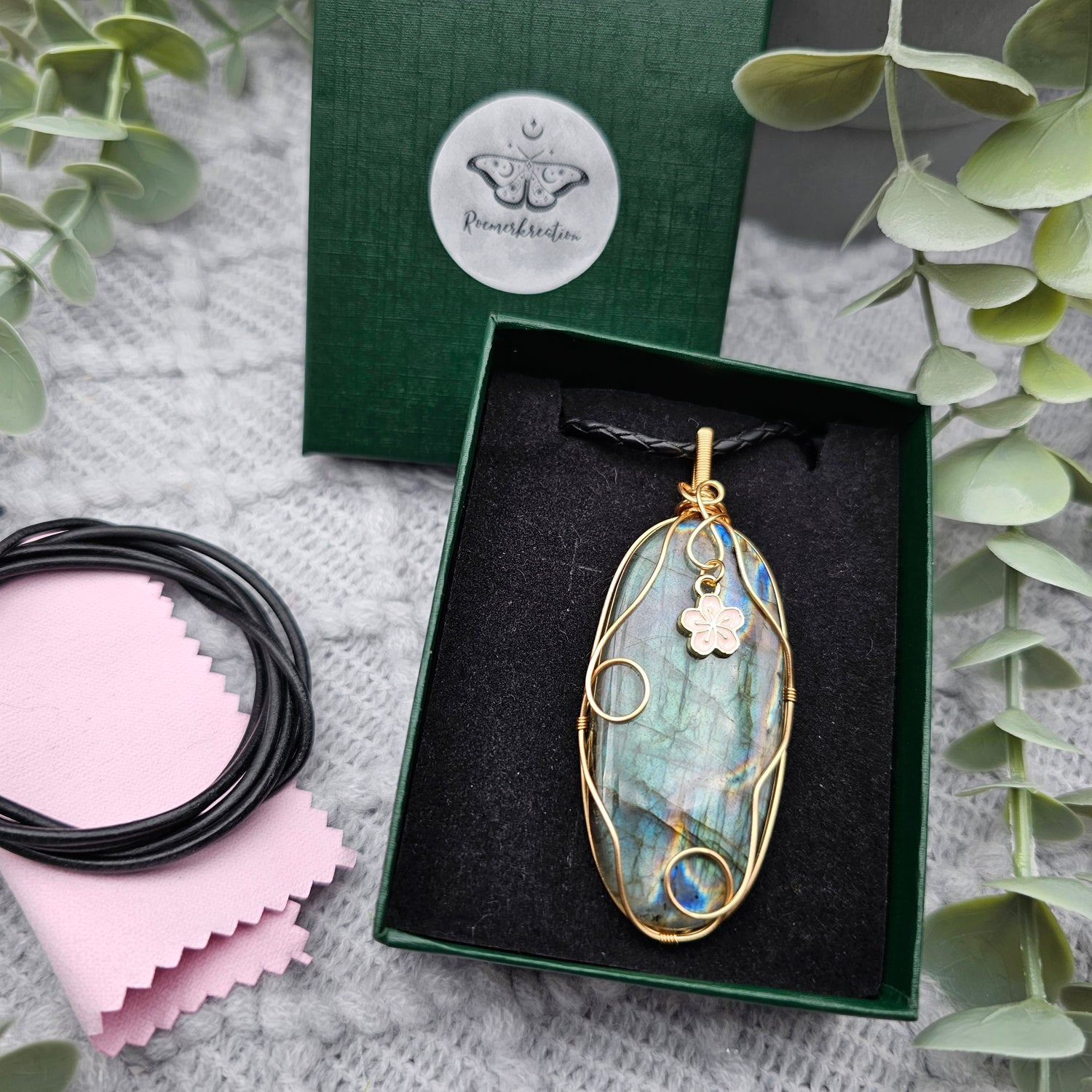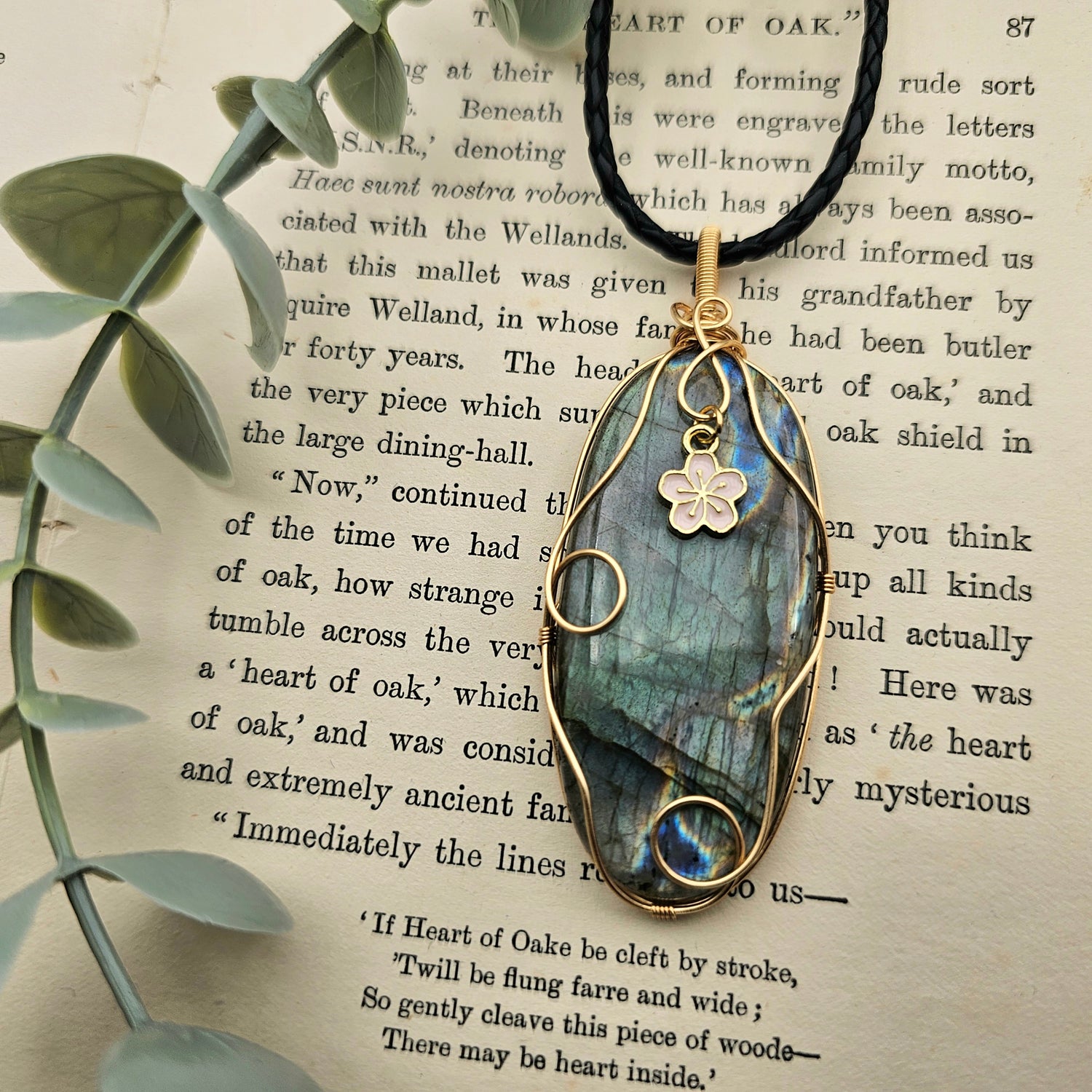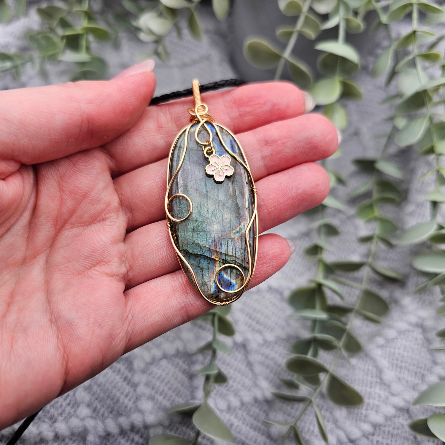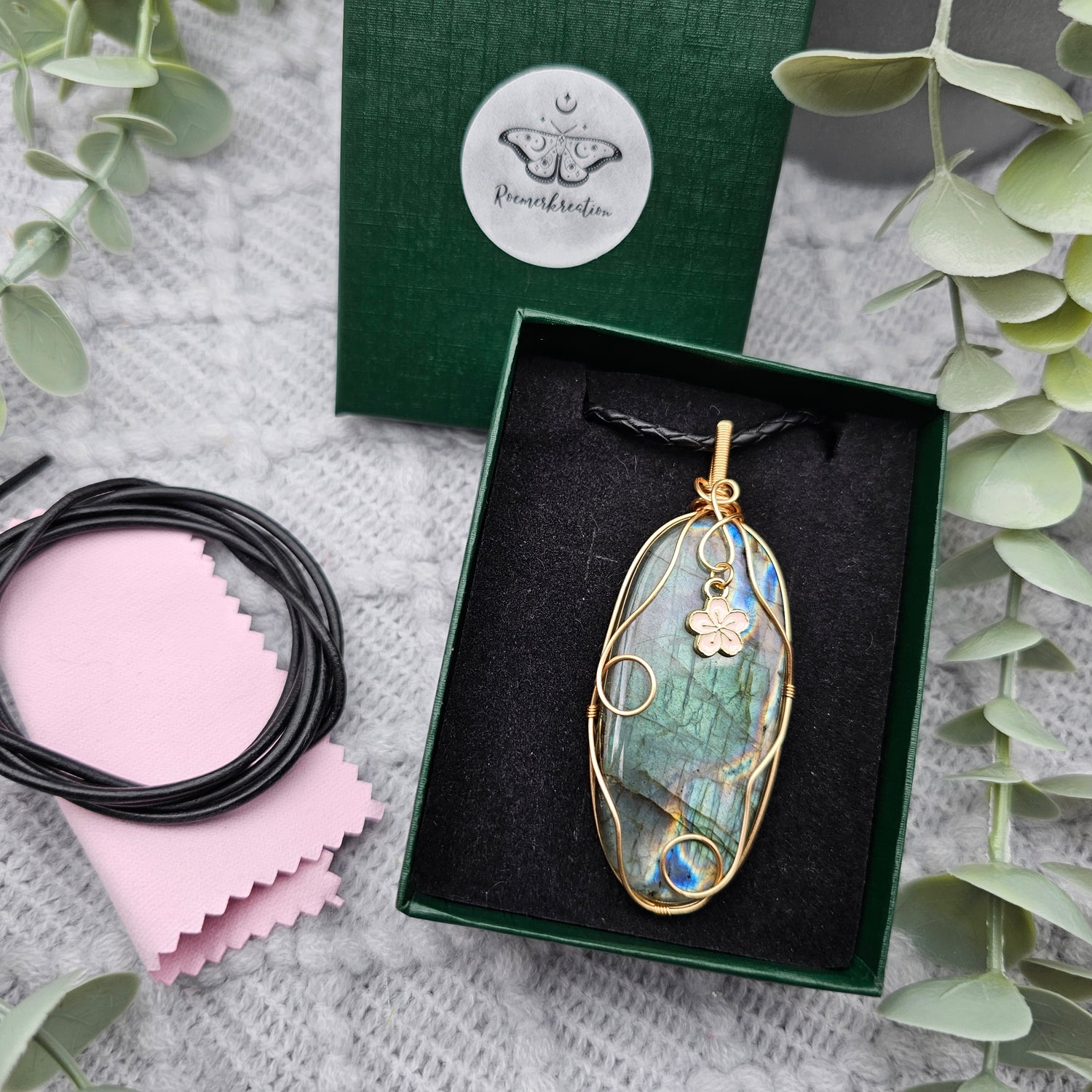 Labradorit & Sakura Anhänger | Schmuckdraht | Edelstein Halskette