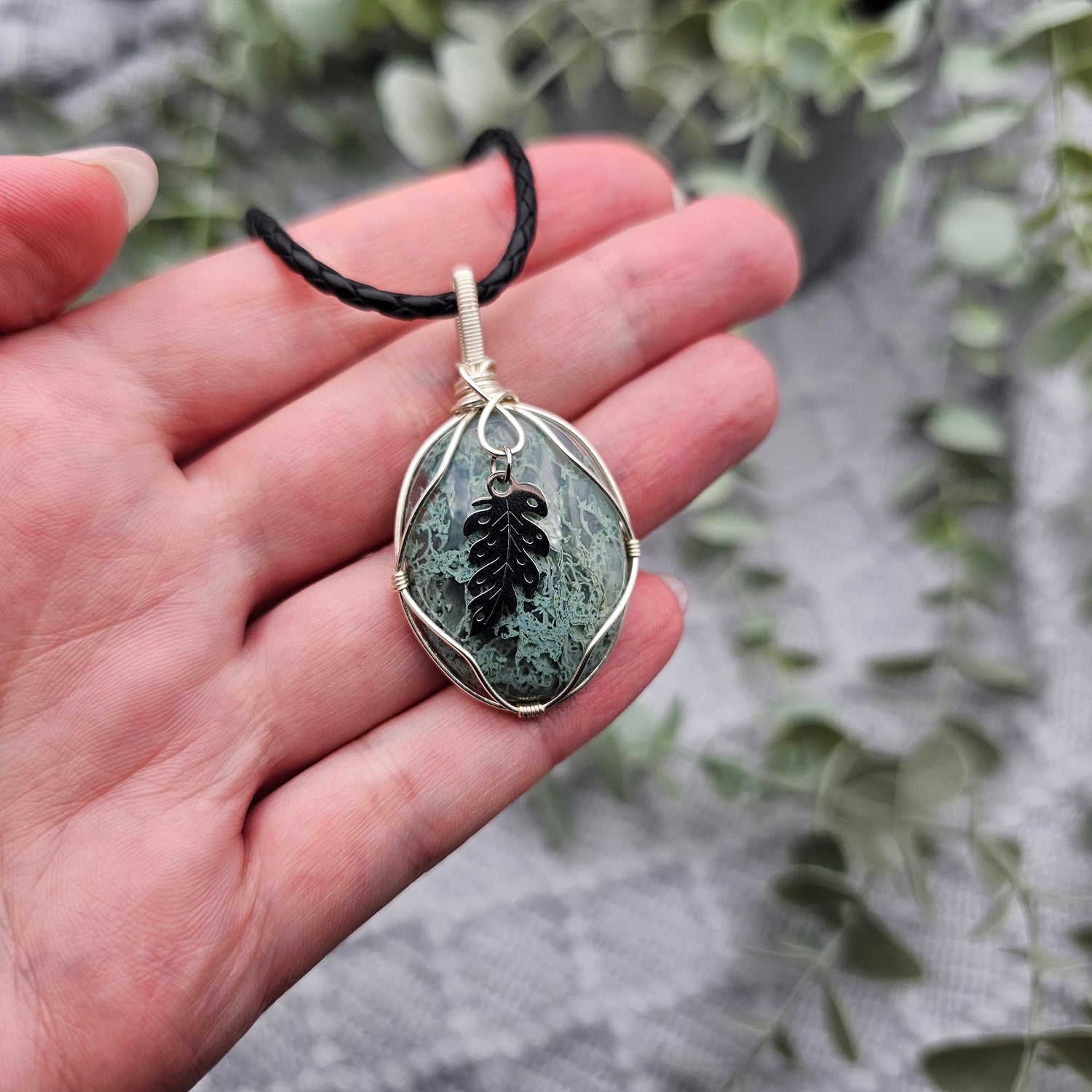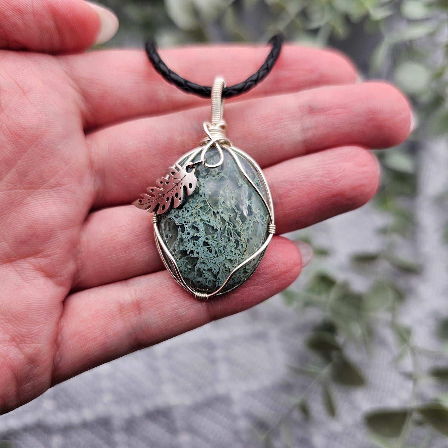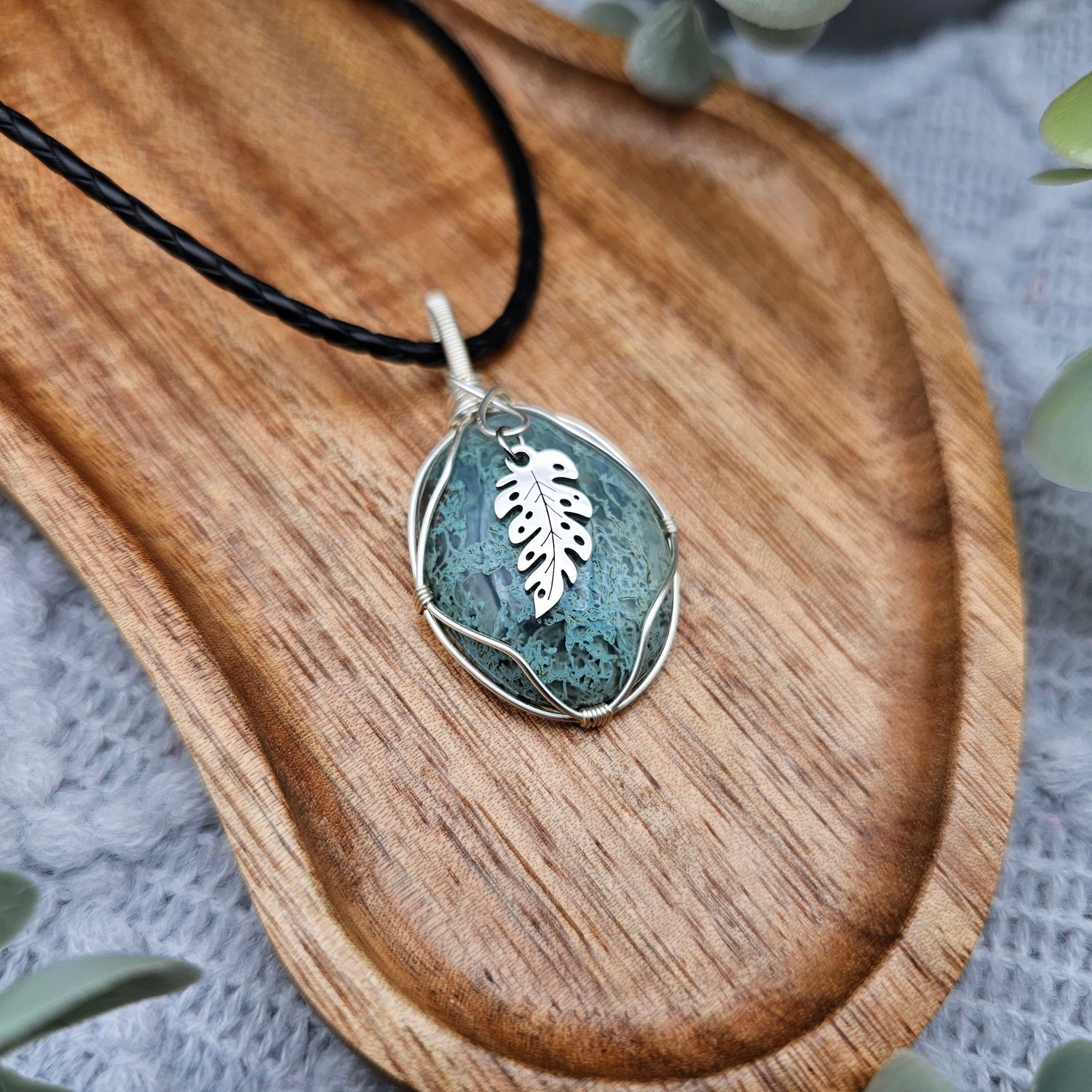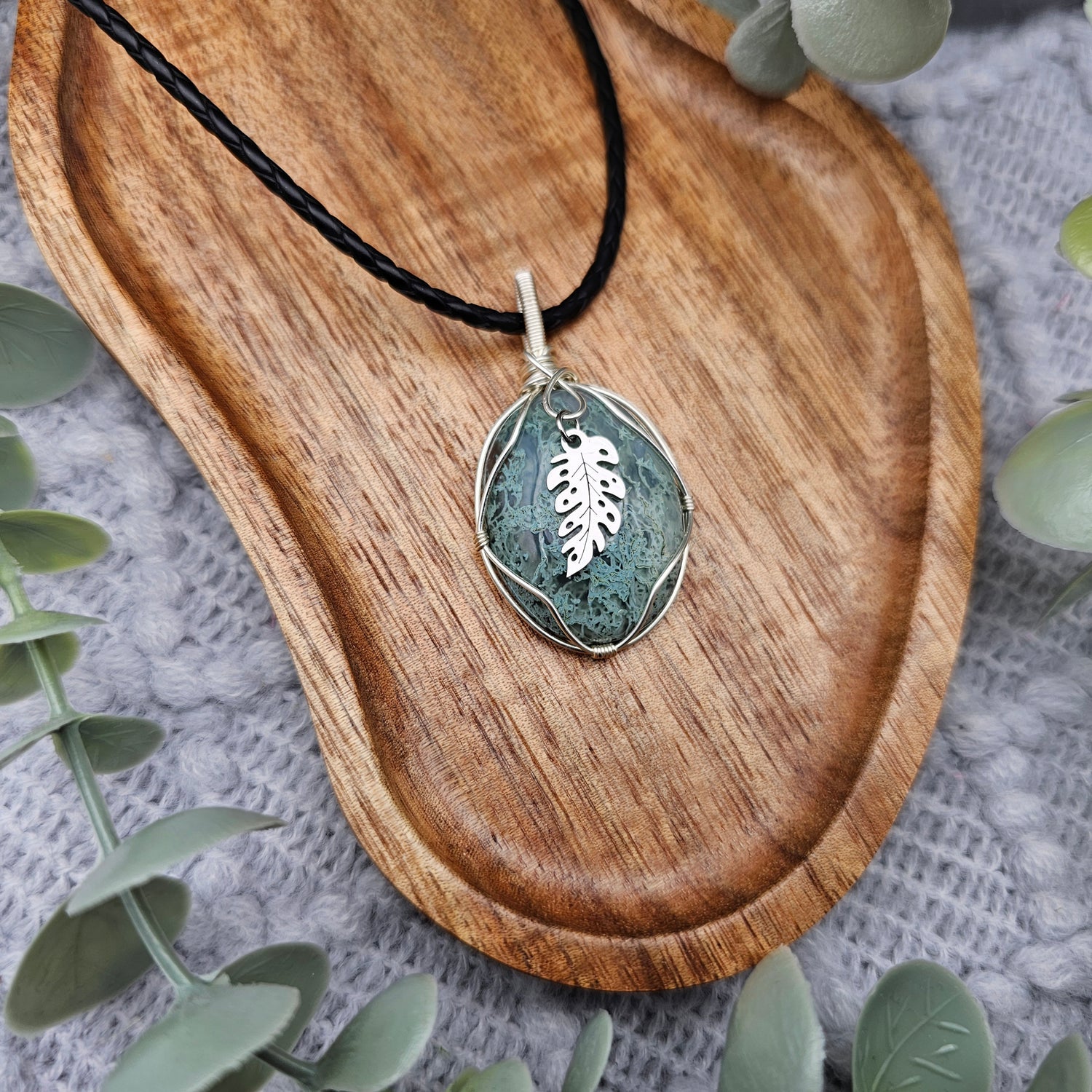 Moosachat & Blatt Anhänger | Schmuckdraht | Edelstein Halskette