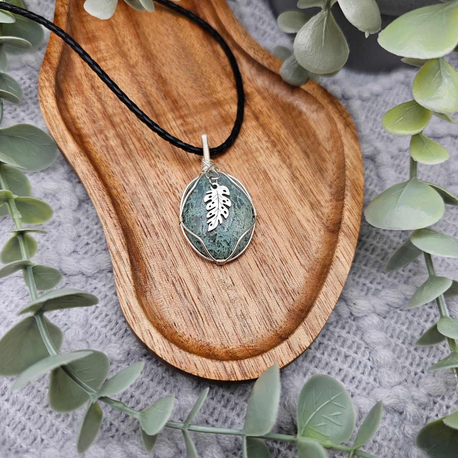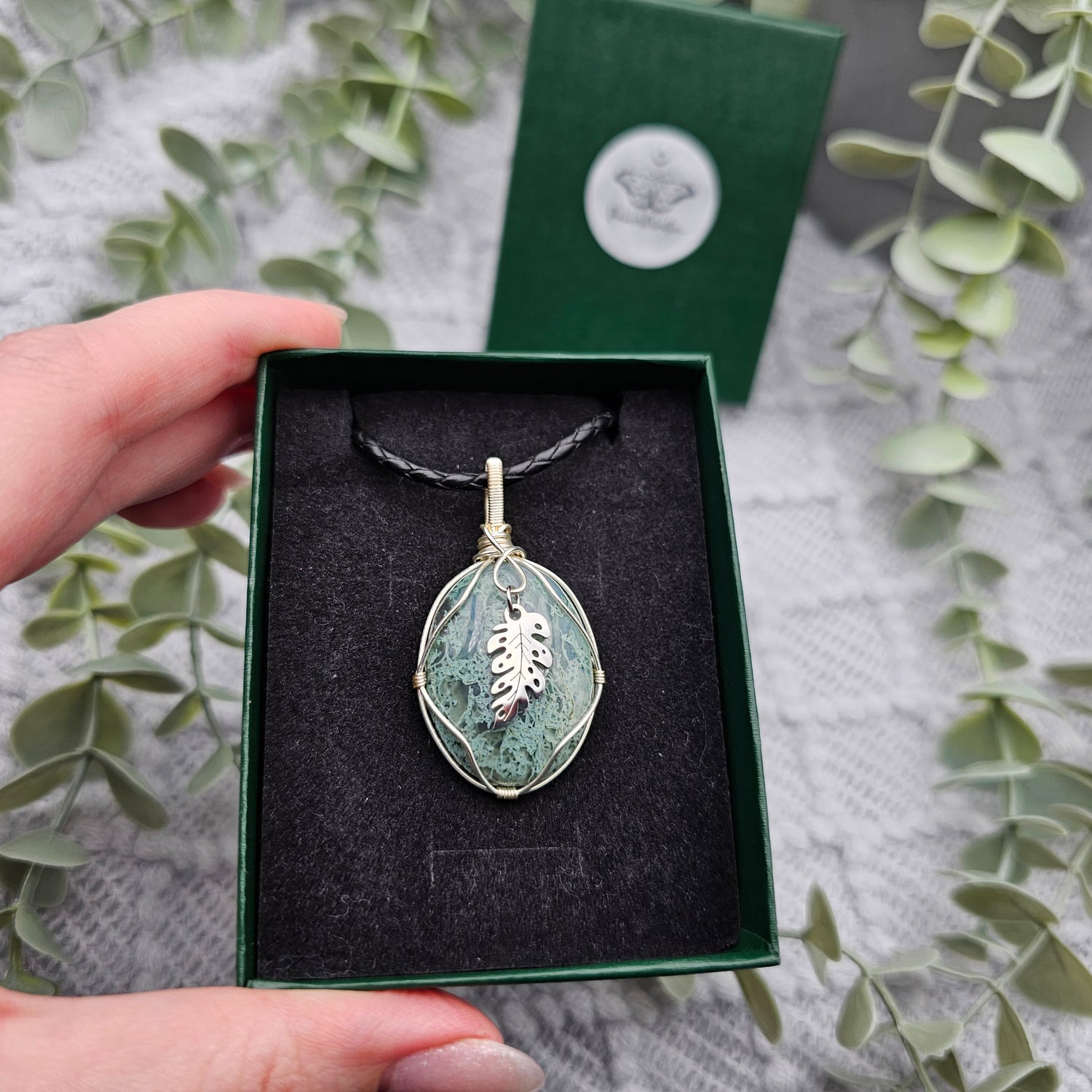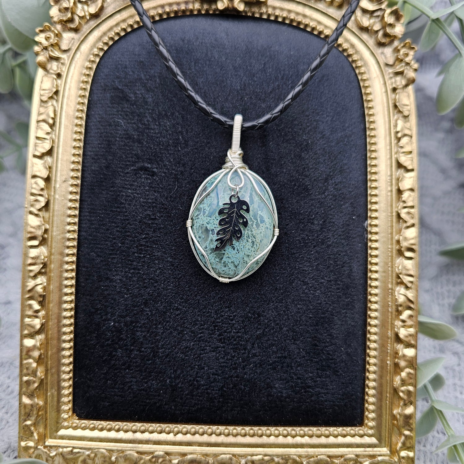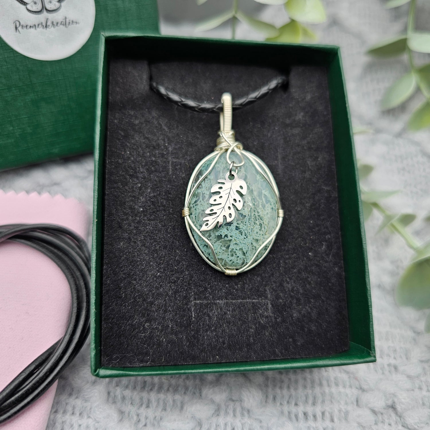 Moosachat & Blatt Anhänger | Schmuckdraht | Edelstein Halskette