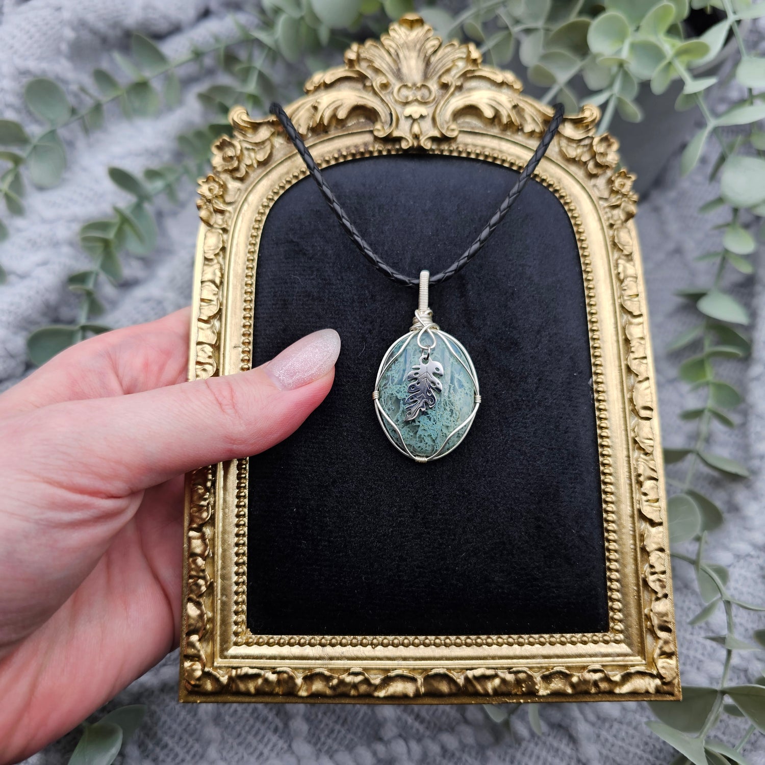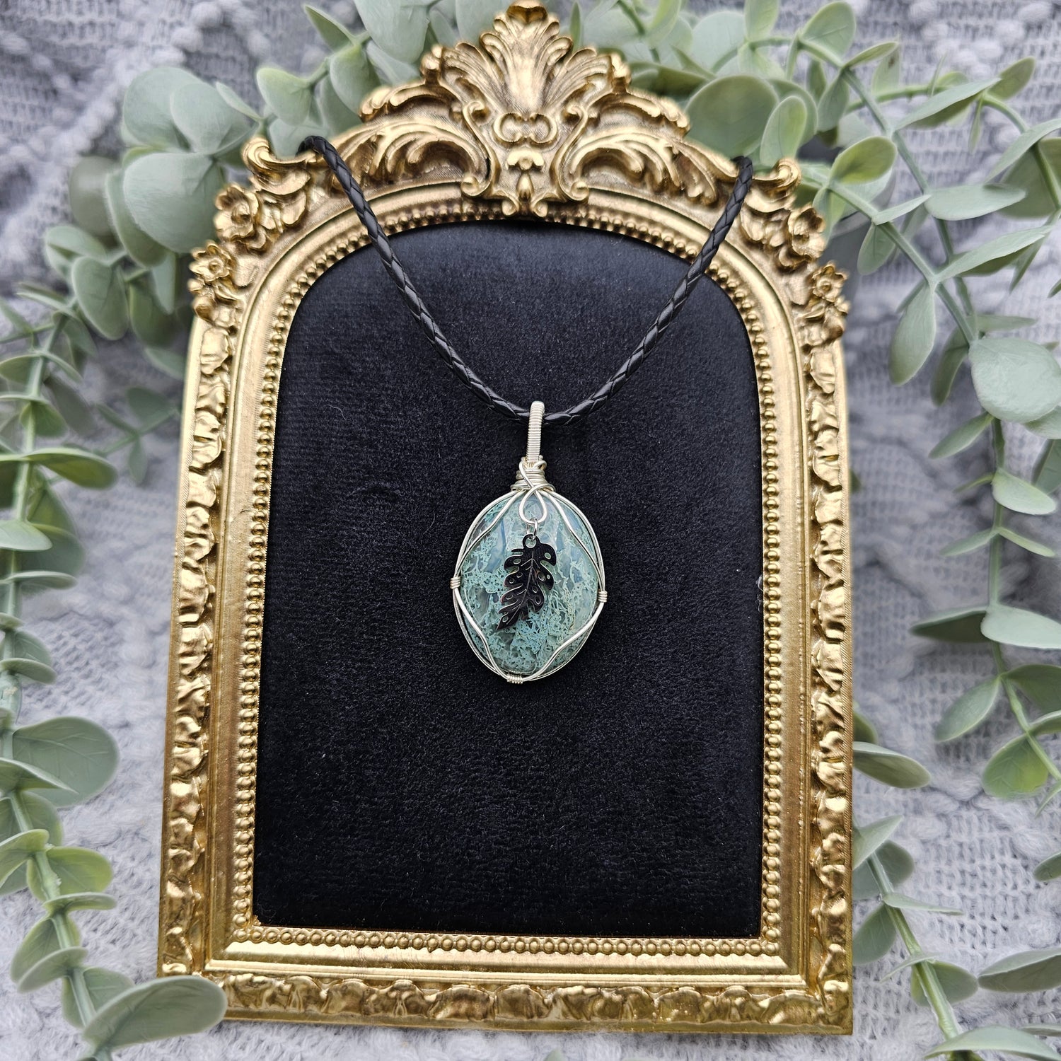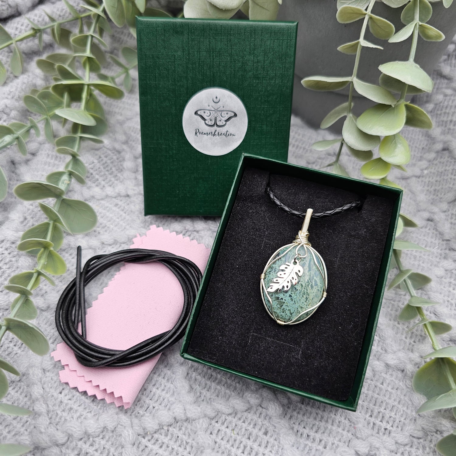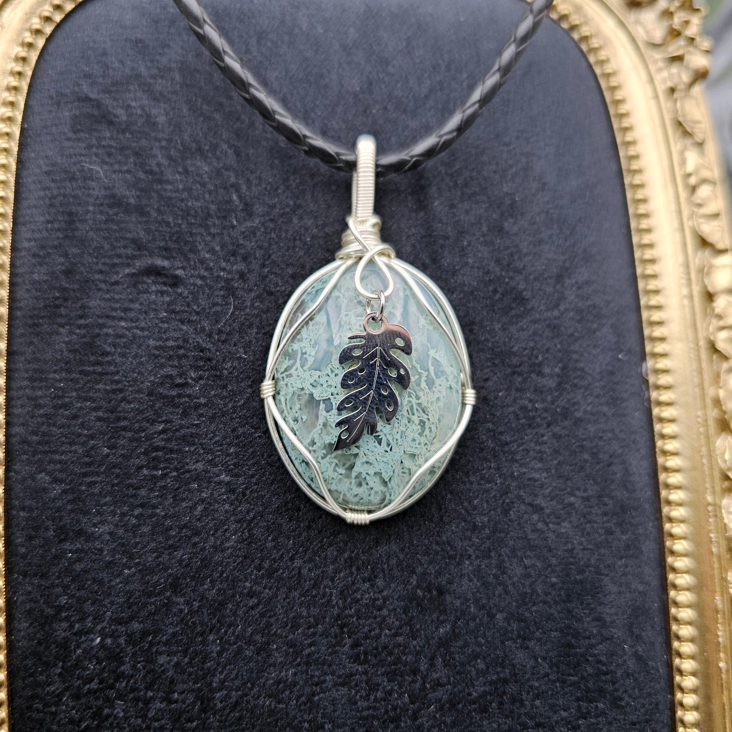 Moosachat & Blatt Anhänger | Schmuckdraht | Edelstein Halskette