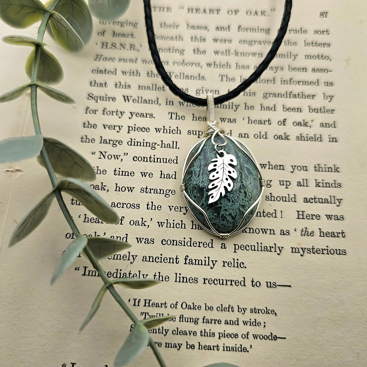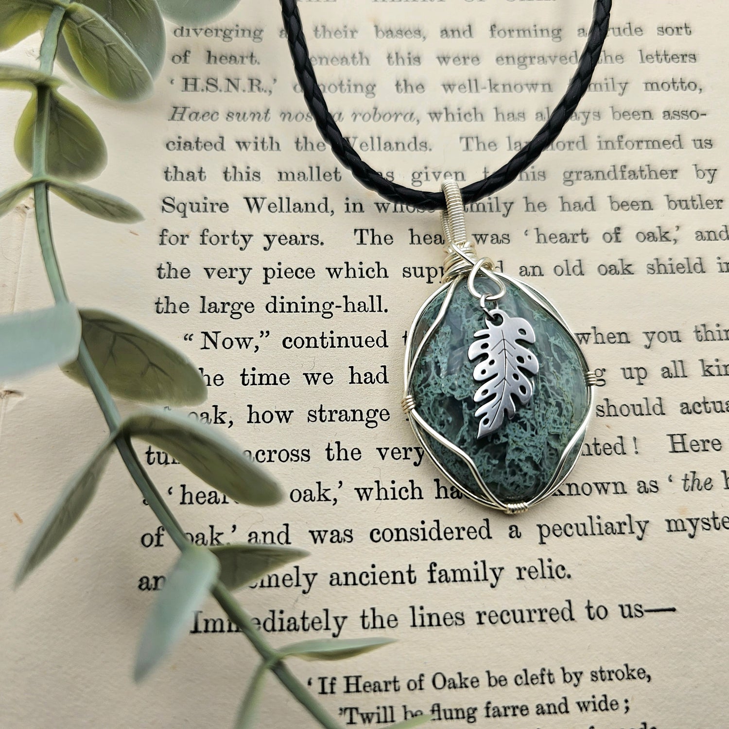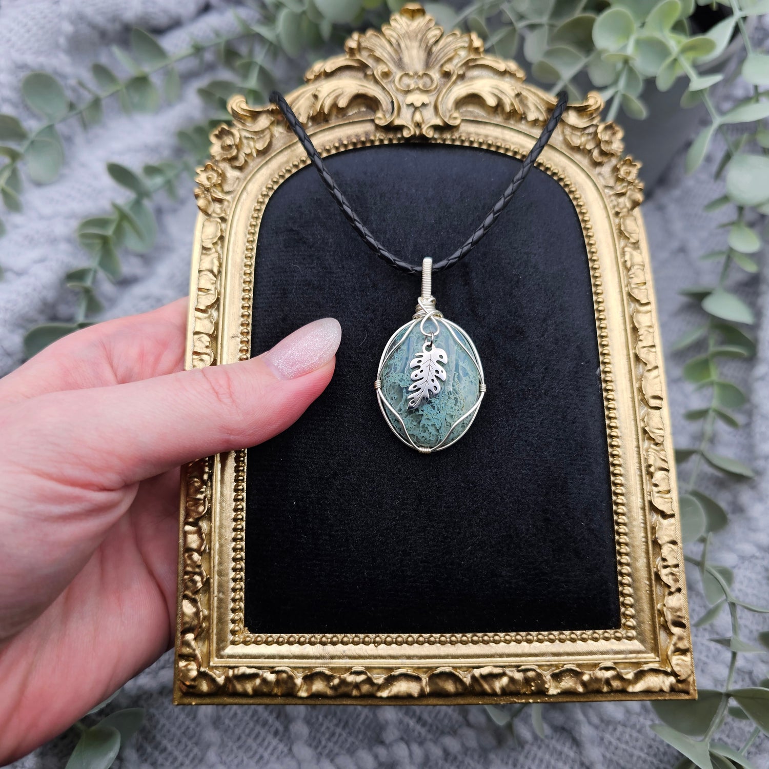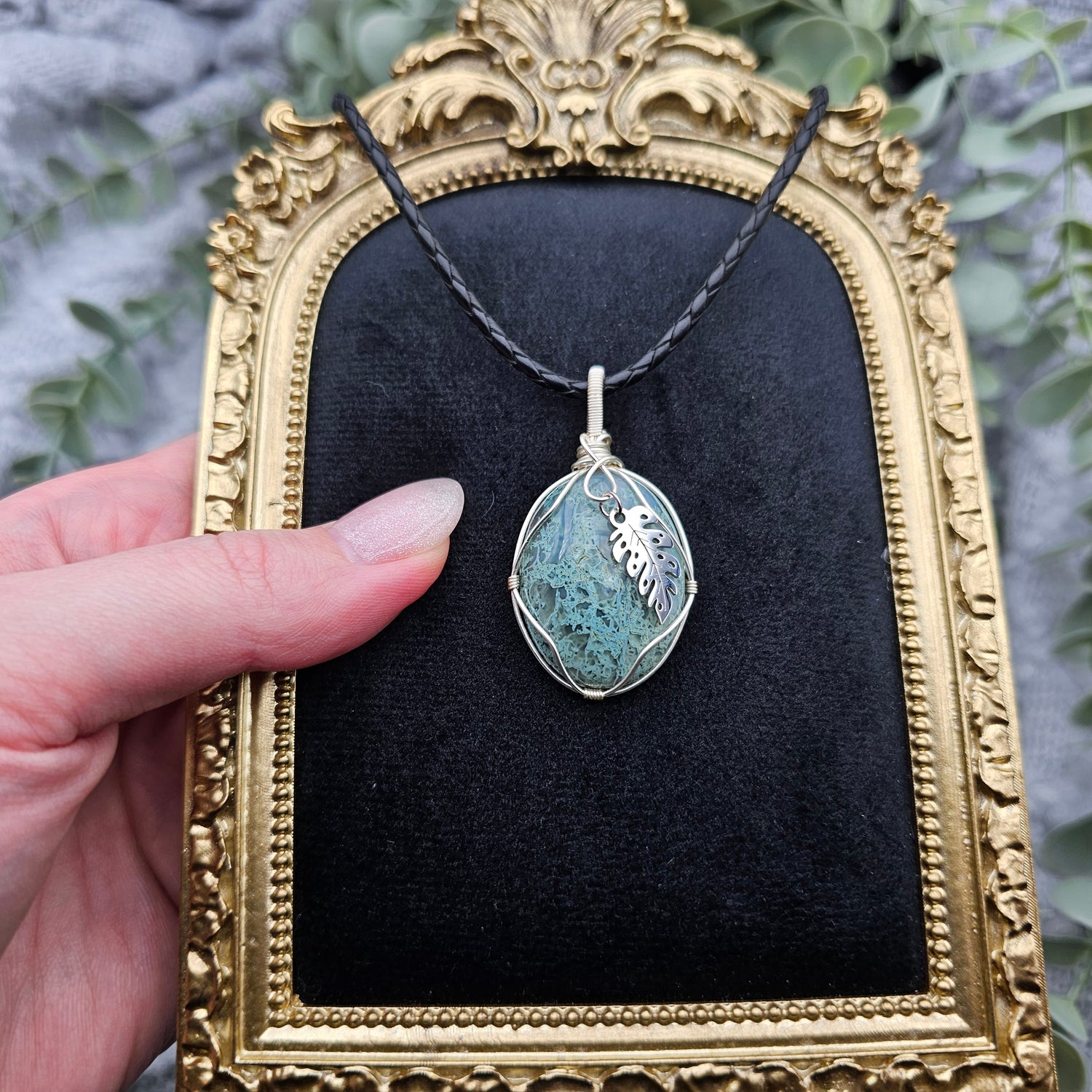 Moosachat & Blatt Anhänger | Schmuckdraht | Edelstein Halskette