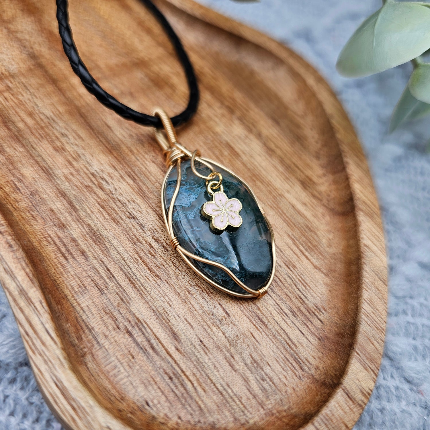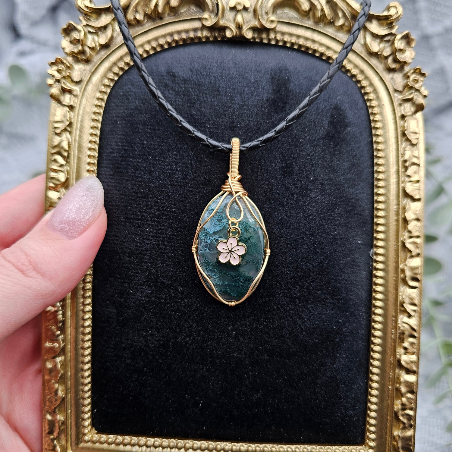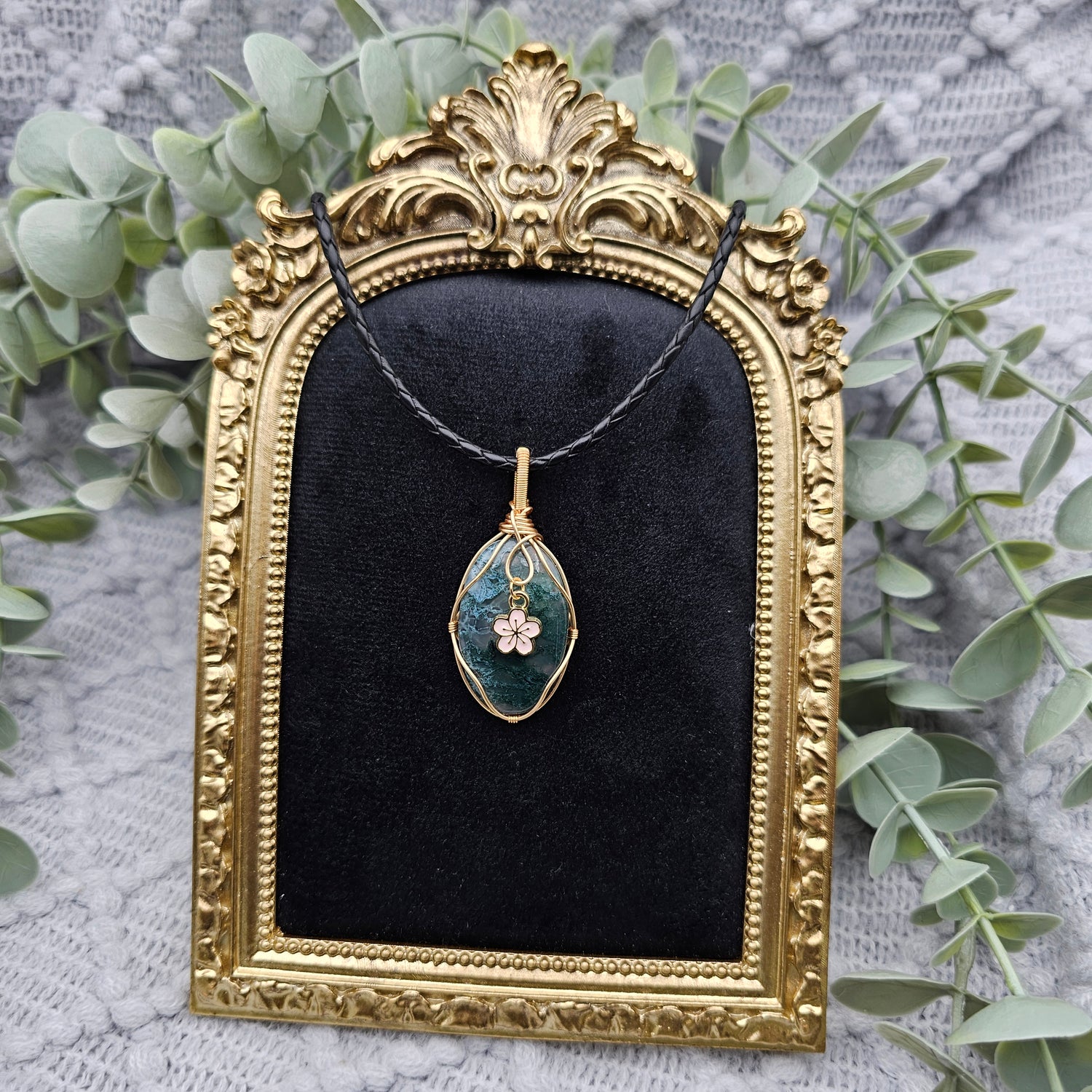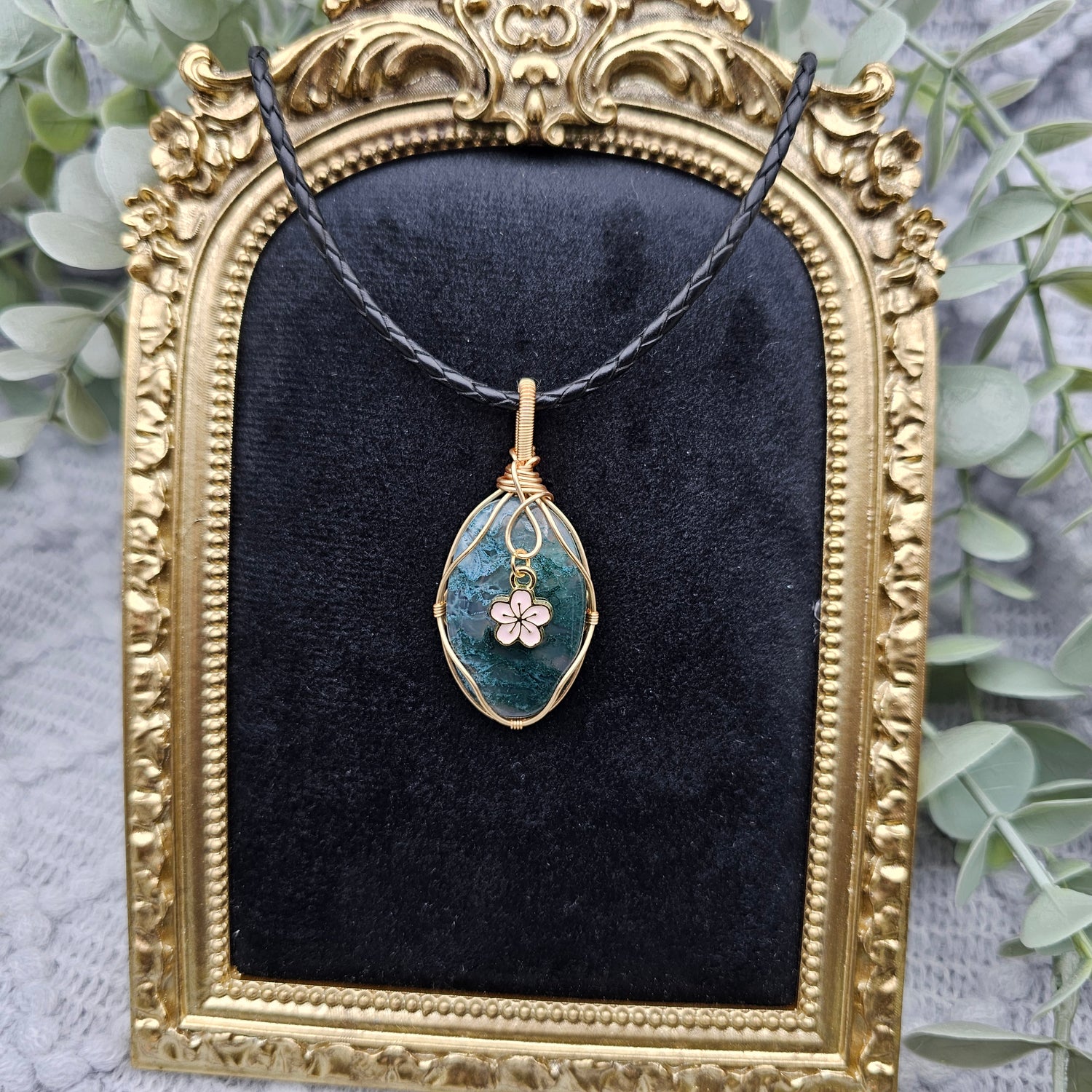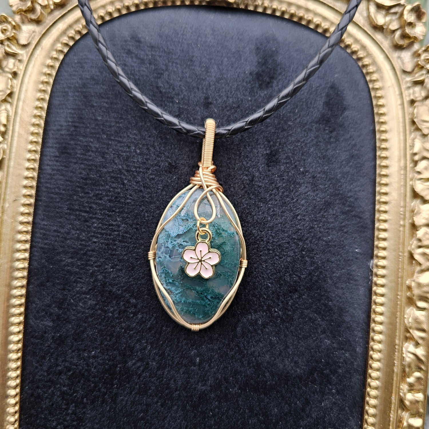 Moosachat & Sakura Anhänger | Schmuckdraht | Edelstein Halskette
