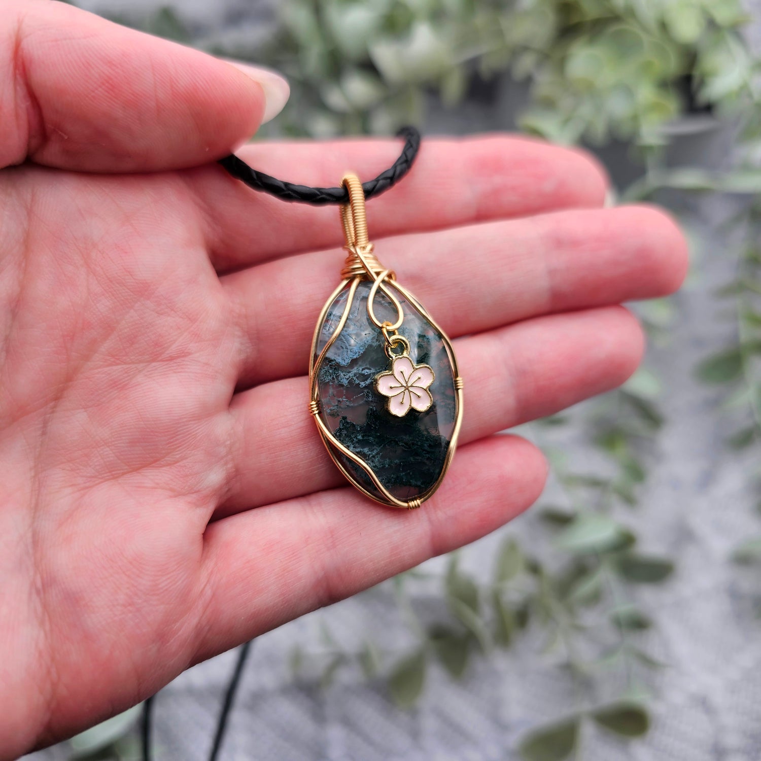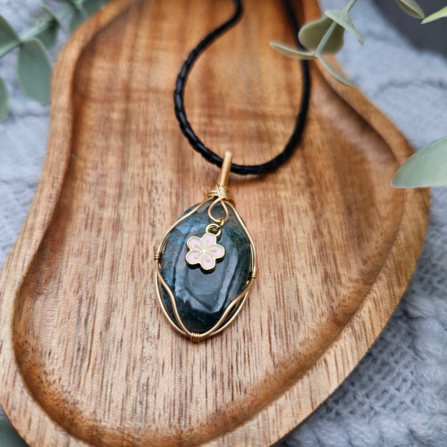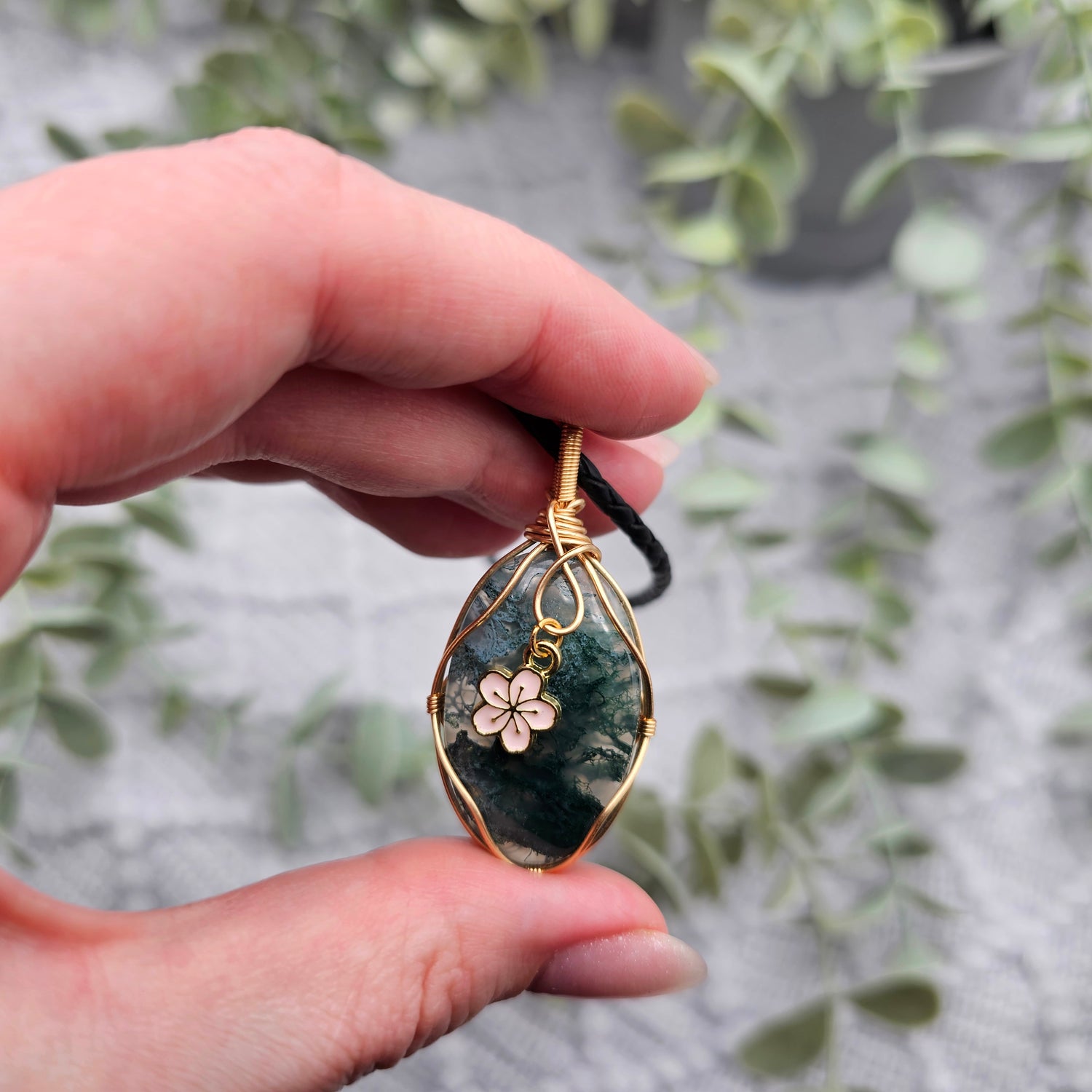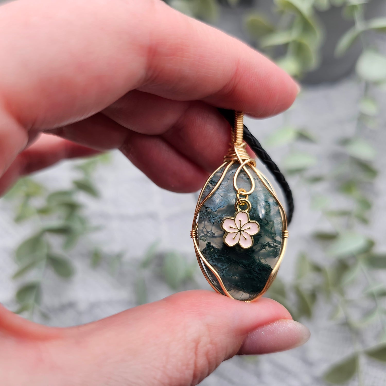 Moosachat & Sakura Anhänger | Schmuckdraht | Edelstein Halskette
