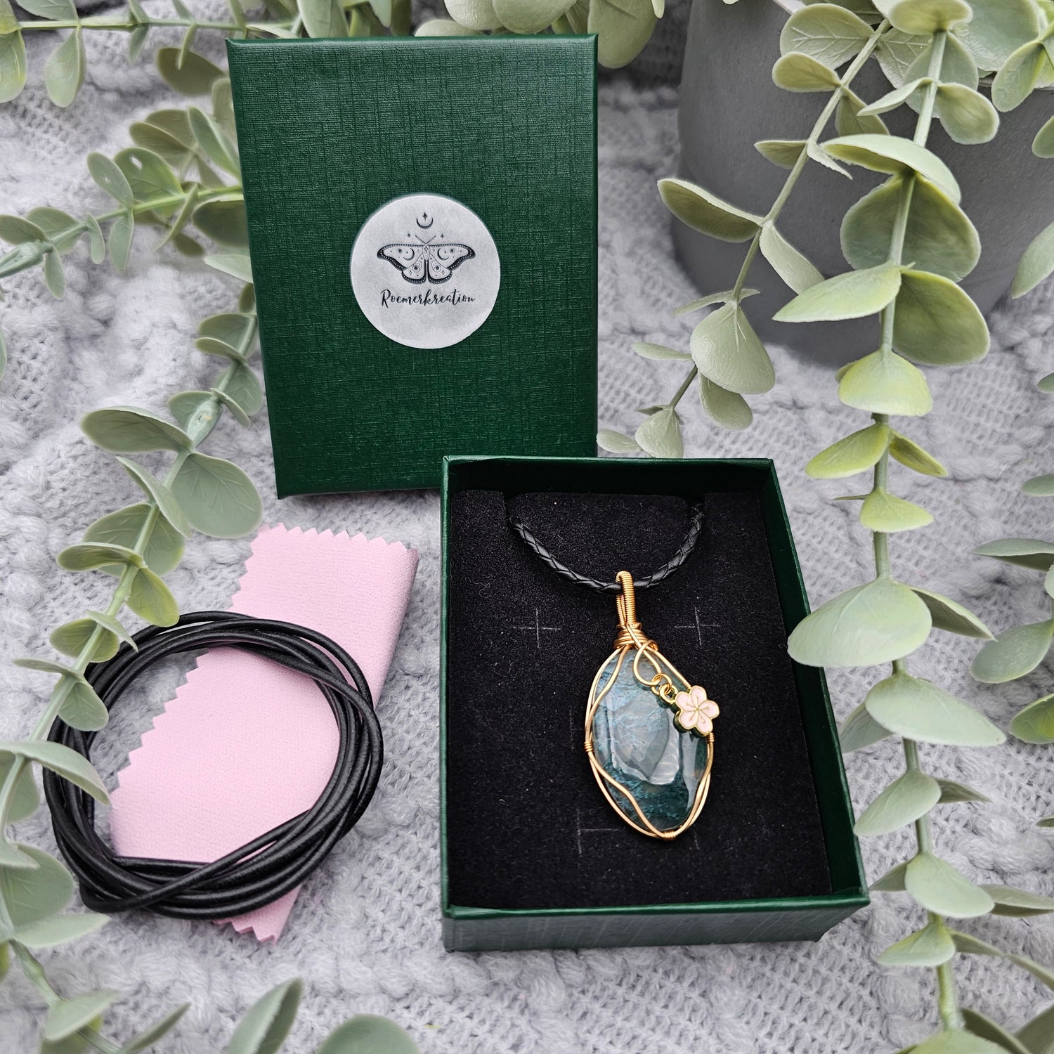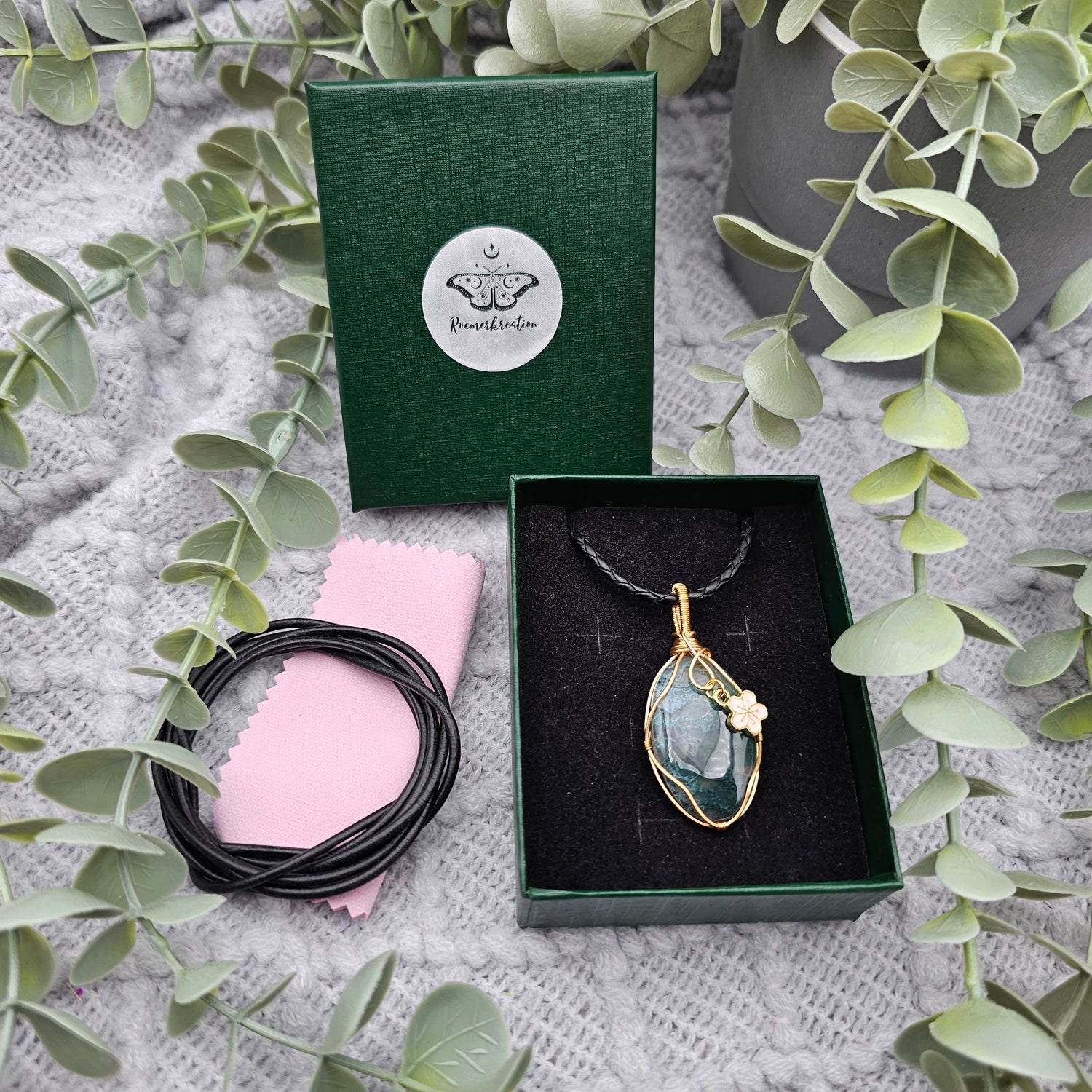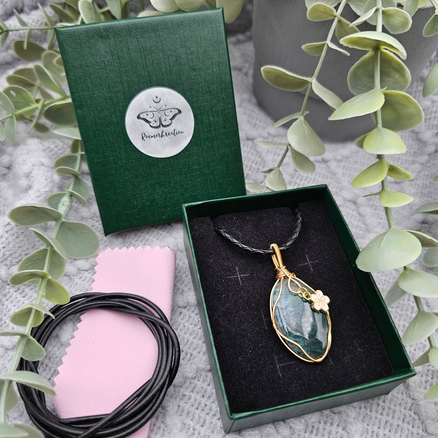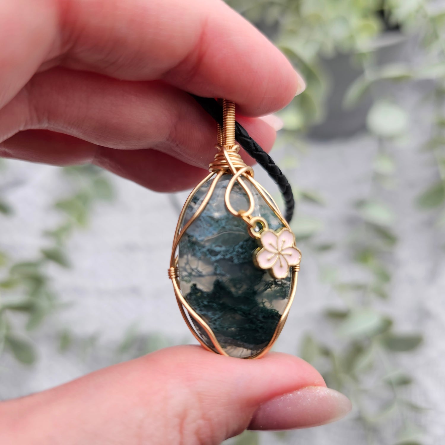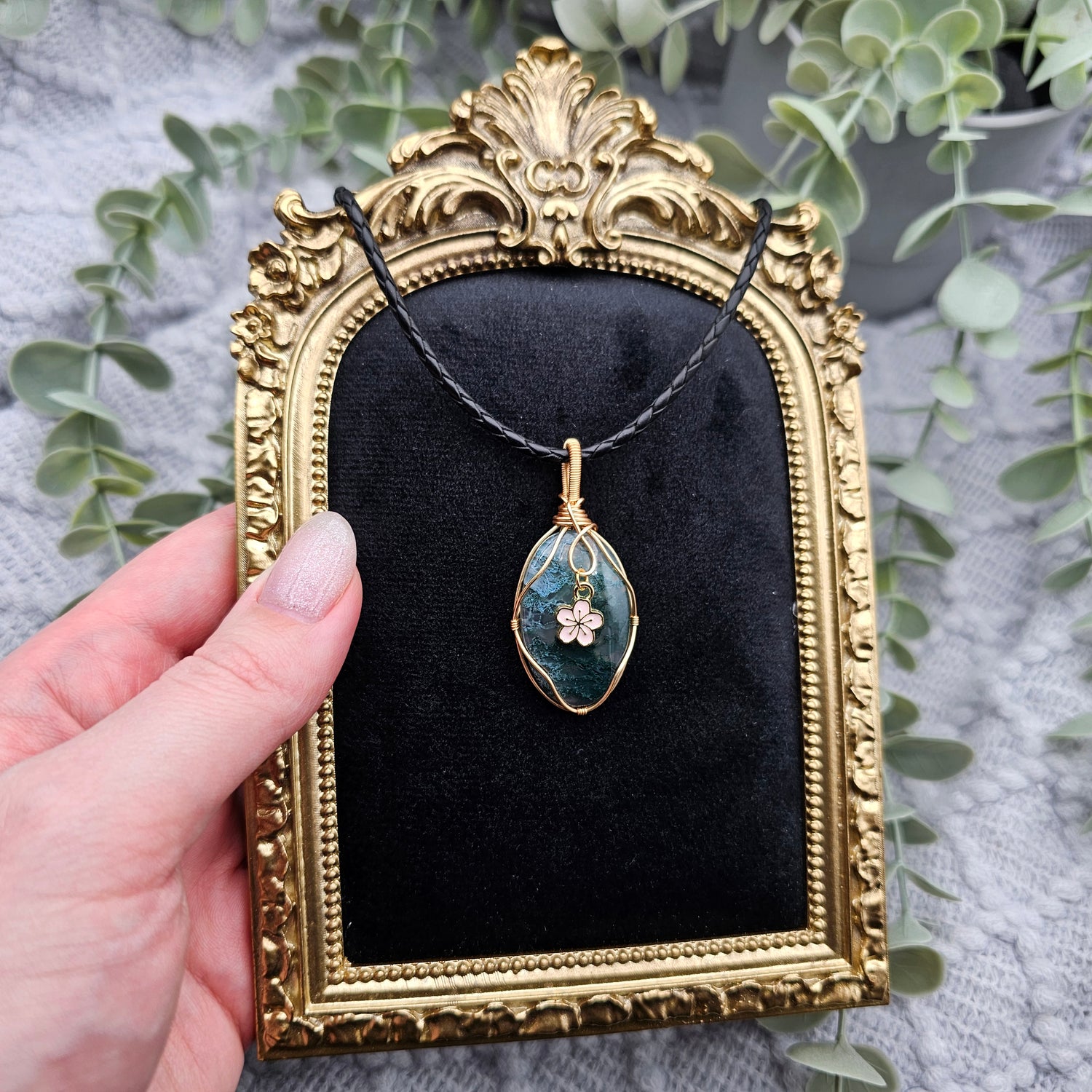 Moosachat & Sakura Anhänger | Schmuckdraht | Edelstein Halskette