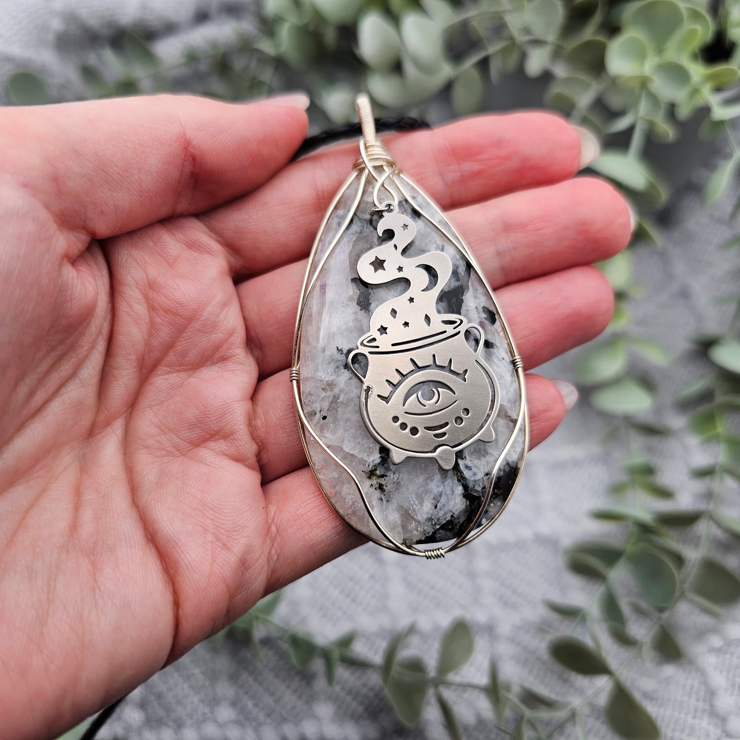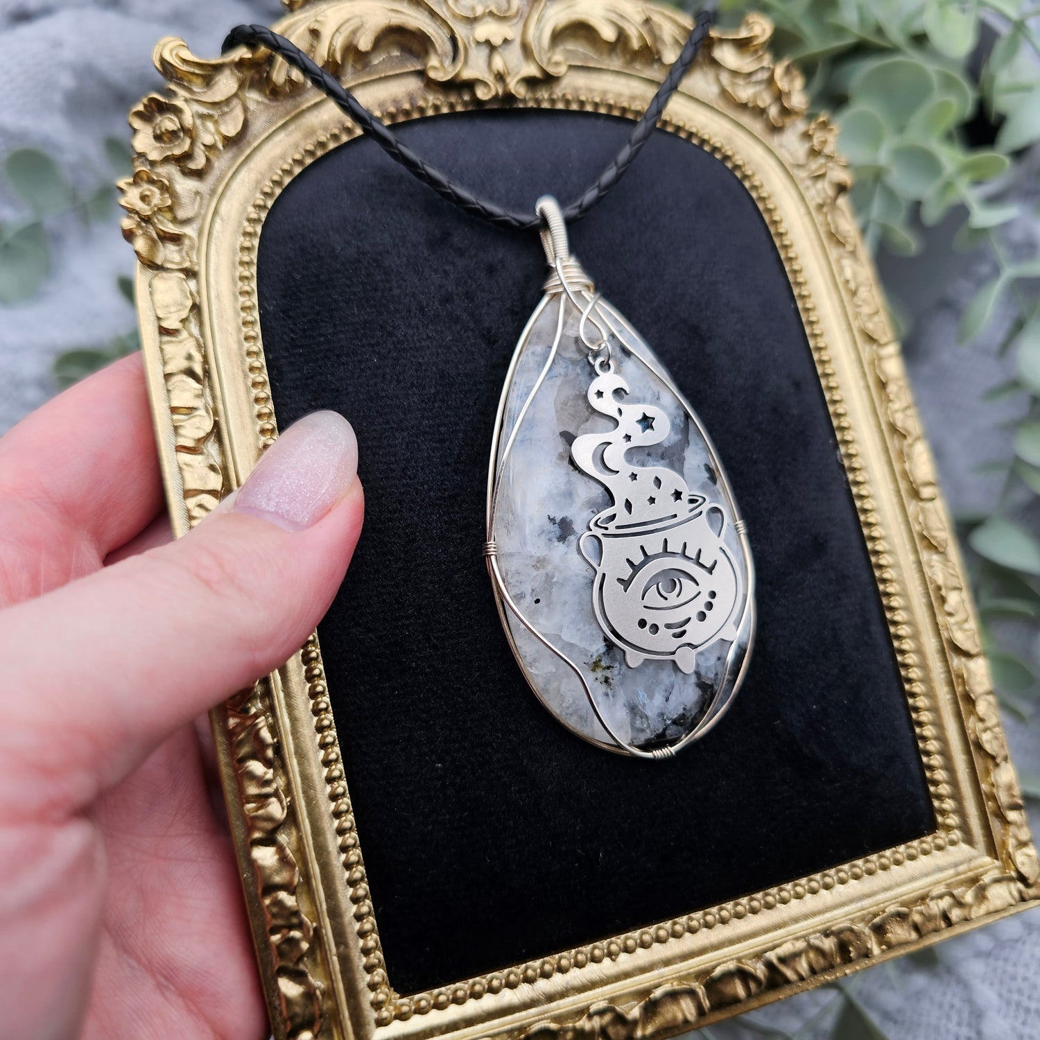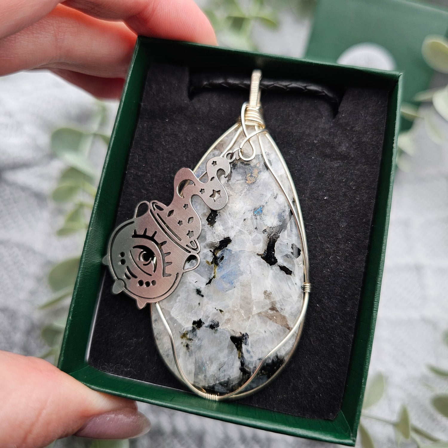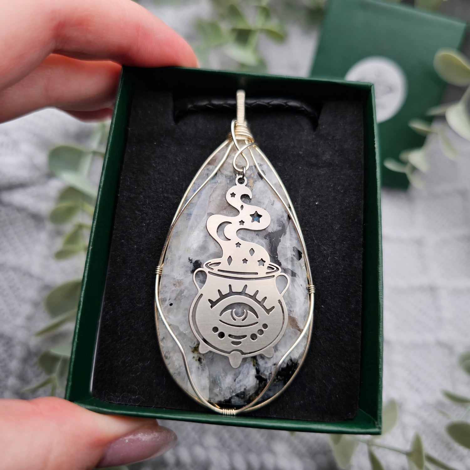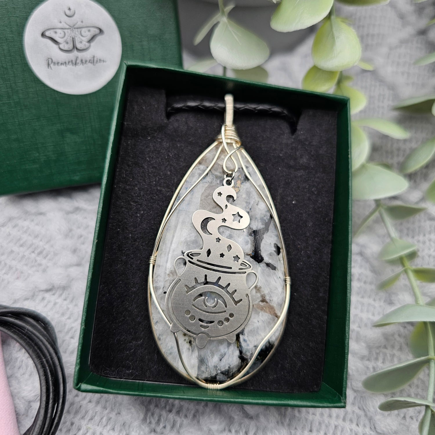 Regenbogenmondstein & Zauberkessel Anhänger | 925er Silber/ Edelstahl | Edelstein Halskette