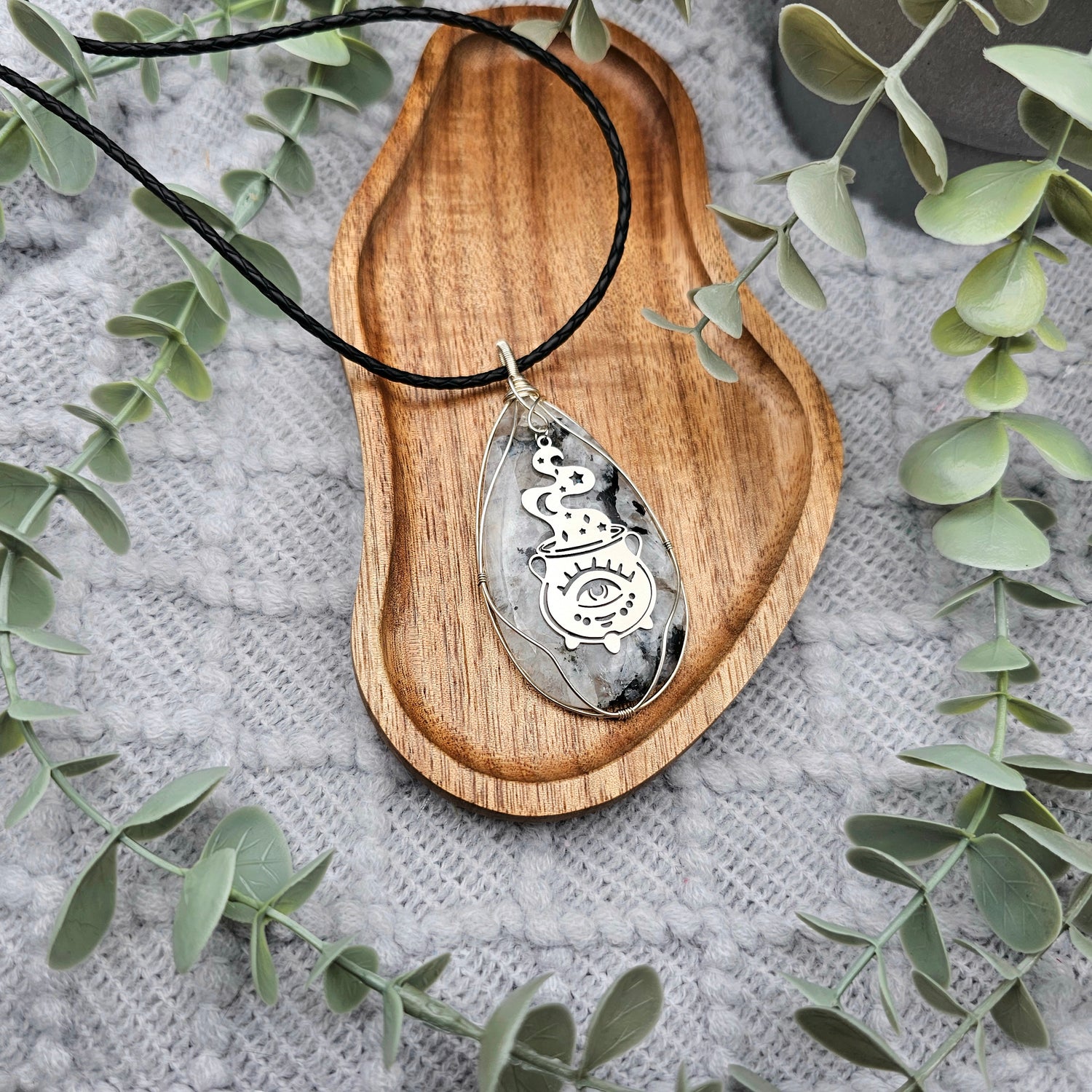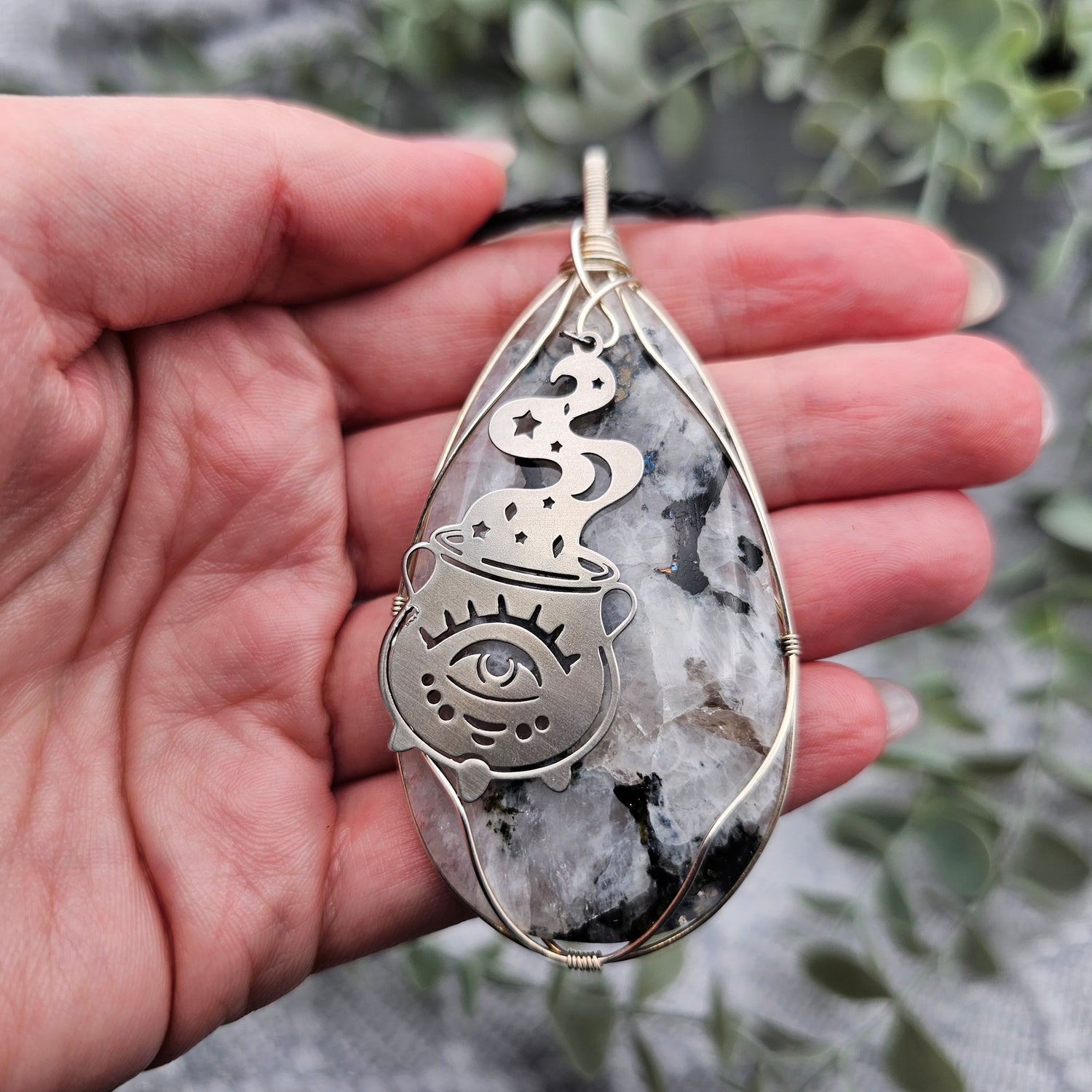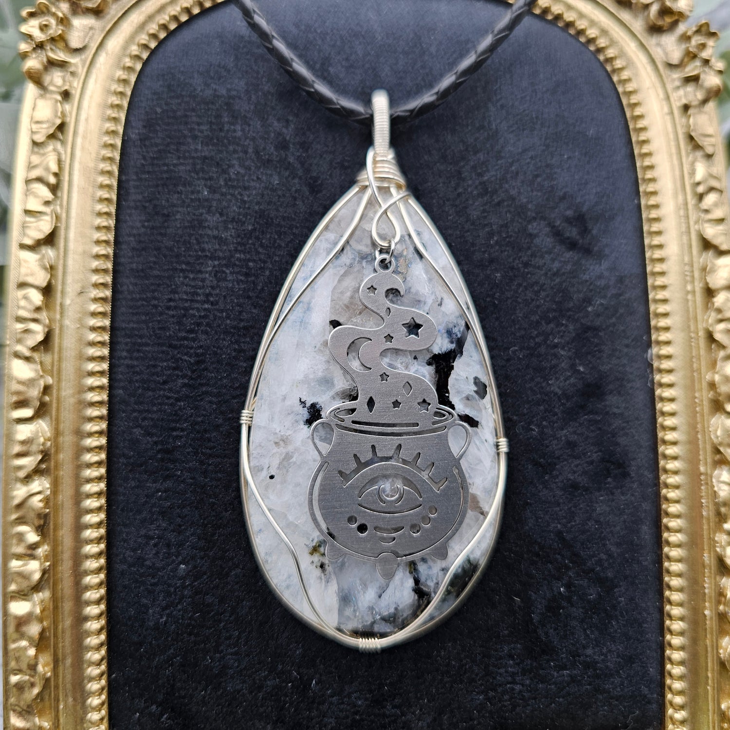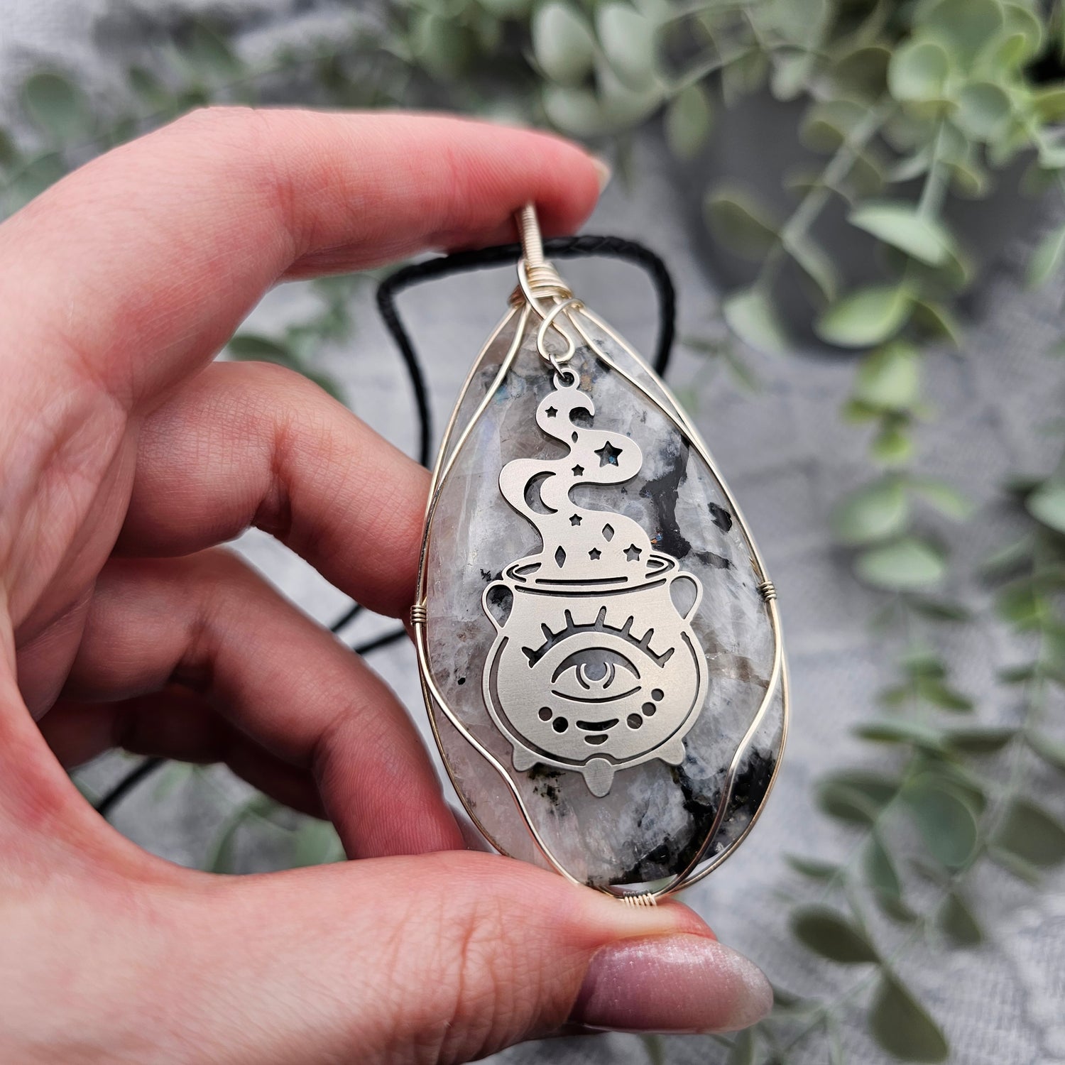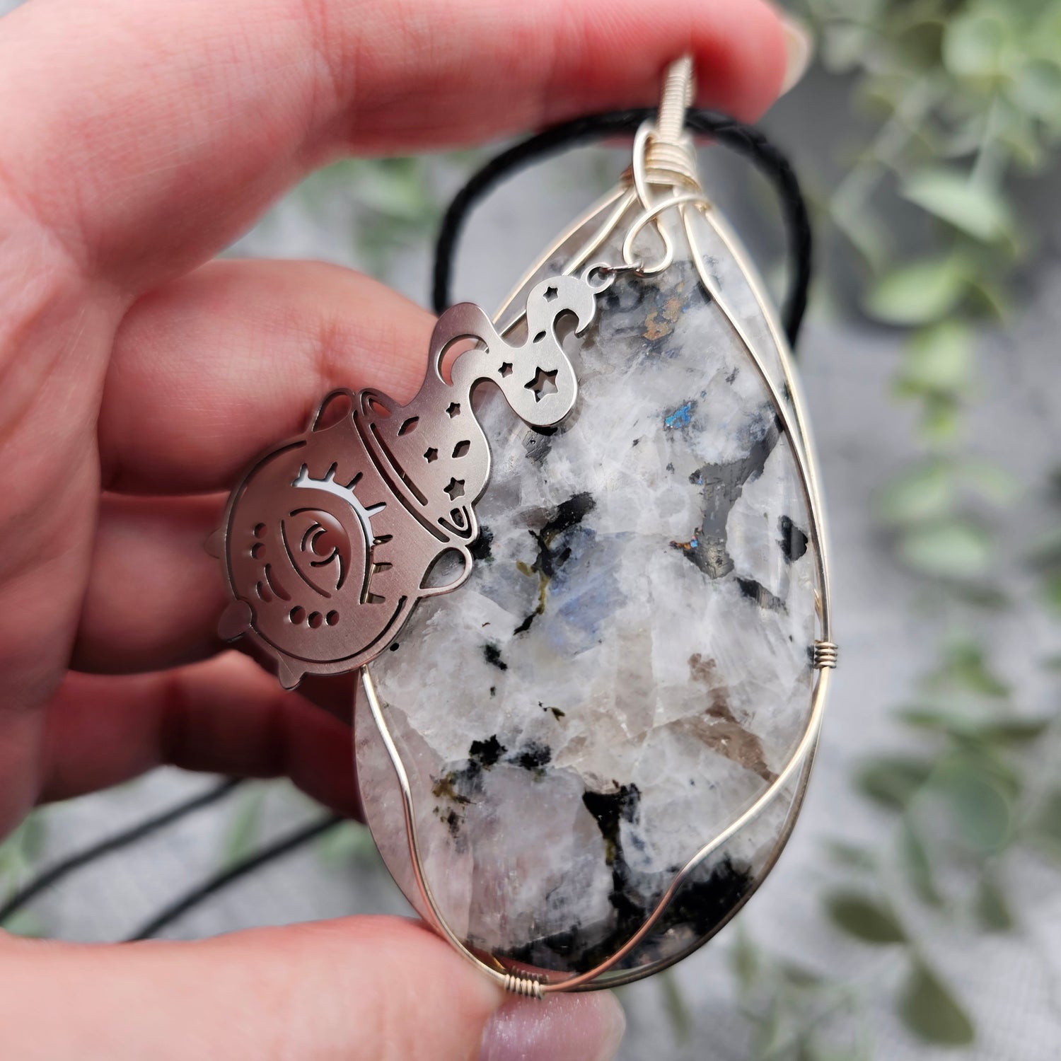 Regenbogenmondstein & Zauberkessel Anhänger | 925er Silber/ Edelstahl | Edelstein Halskette